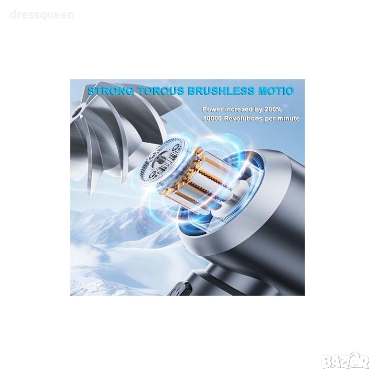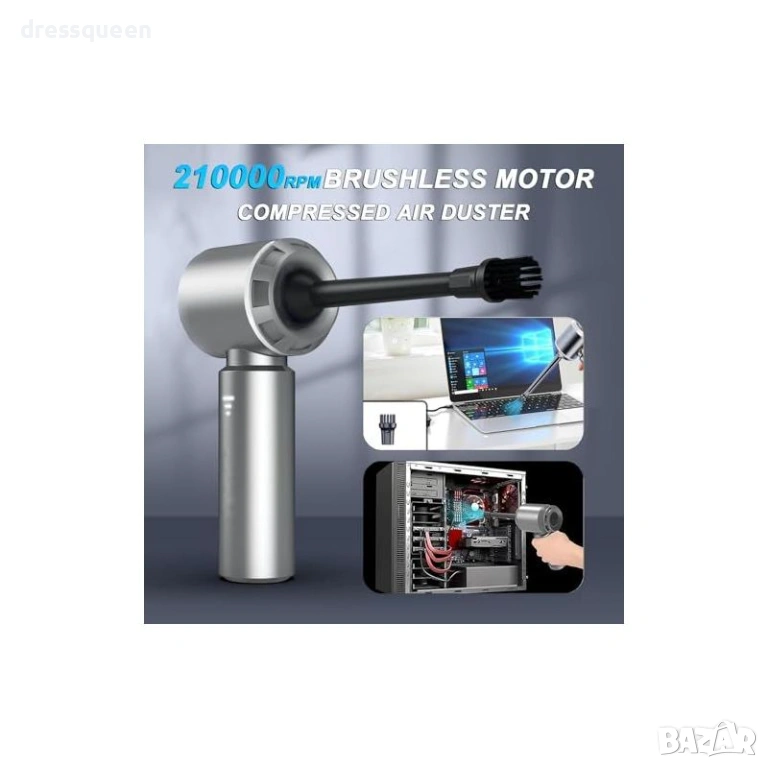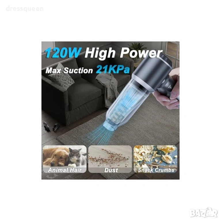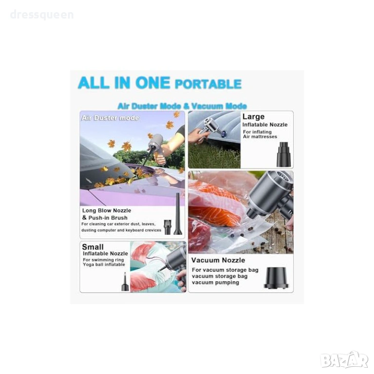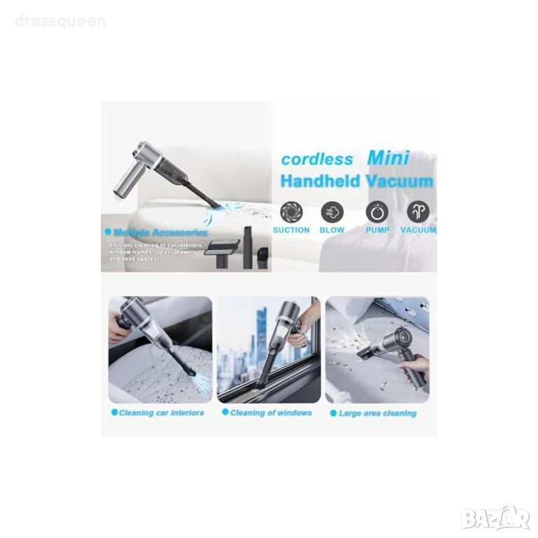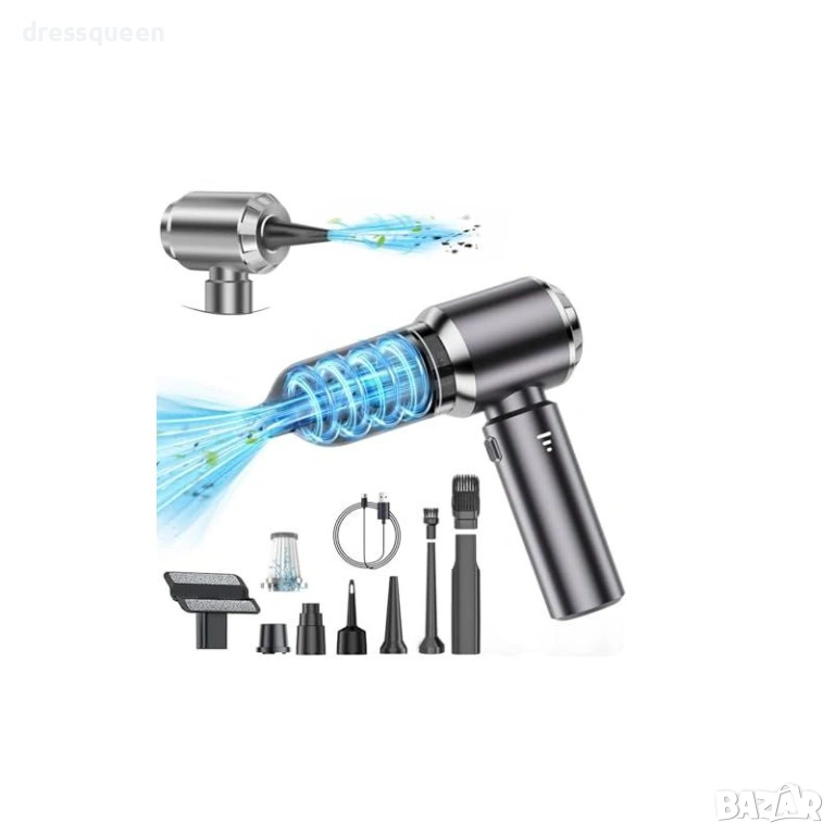 Многофункционалност: Предлага засмукване и издухване, което я прави перфектна за почистване на прах от вентилационни отвори и напомпване на малки предмети.