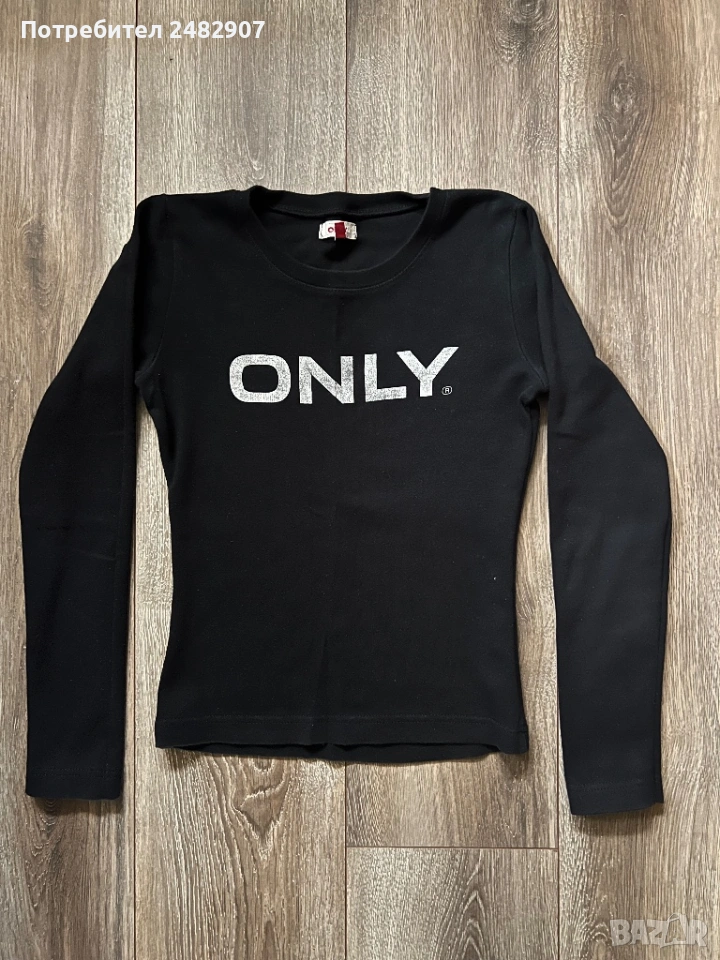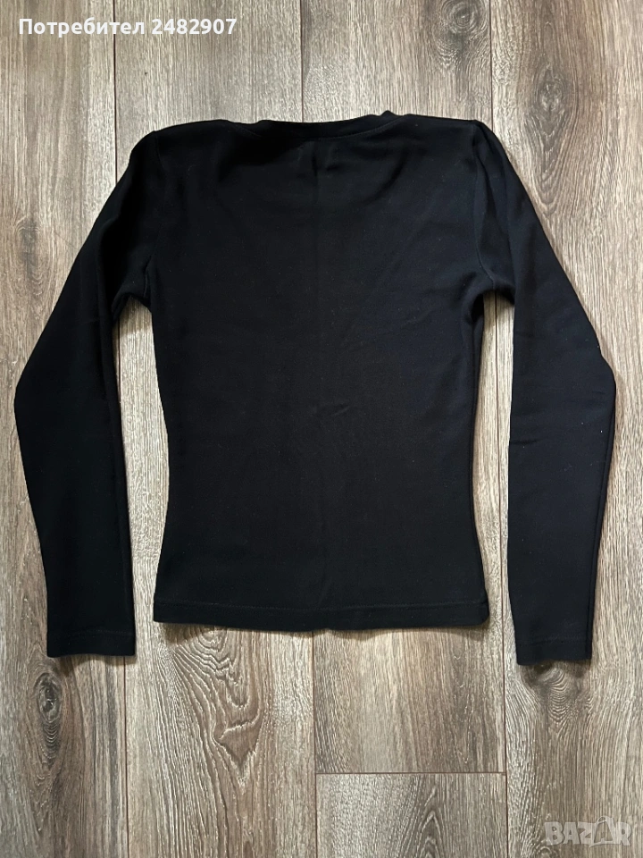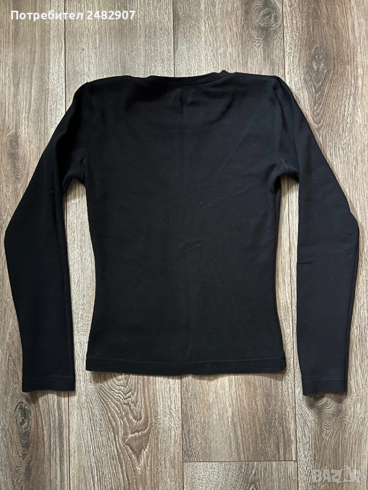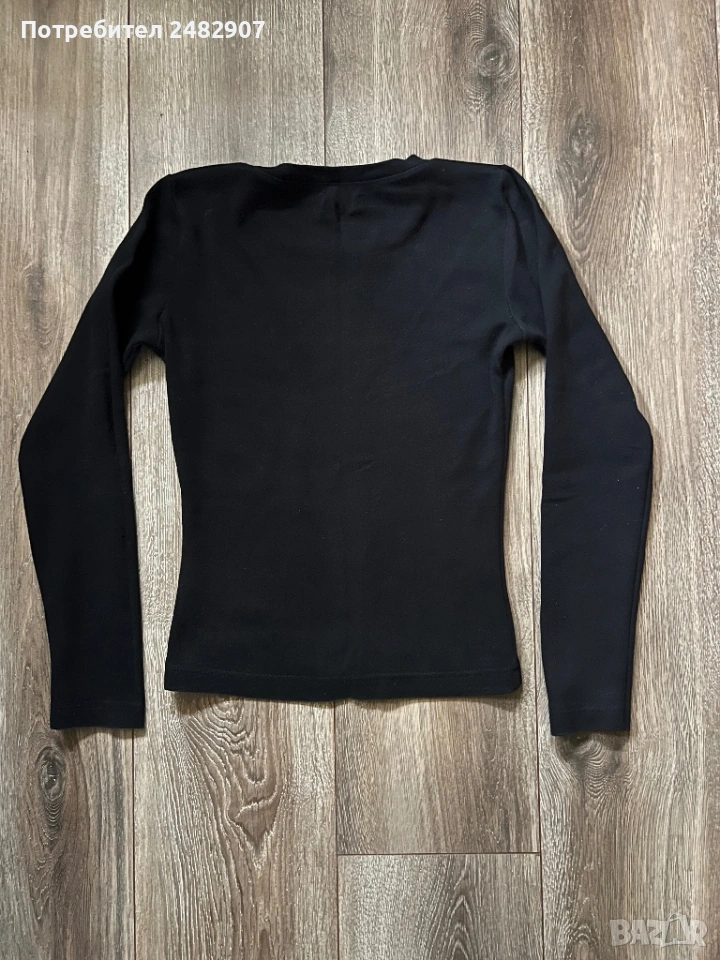 Черна дамска блуза с щампа, размер XS. Ширина в раменете - 33 см, ширина под мишниците - 40 см, ширина в долната част - 36 см, дължина от рамото до долу - 51 см, дължина на ръкава от рамото - 57 см, ширина на ръкава в долната част - 9 см. Много запазена, почти не е използвана.
