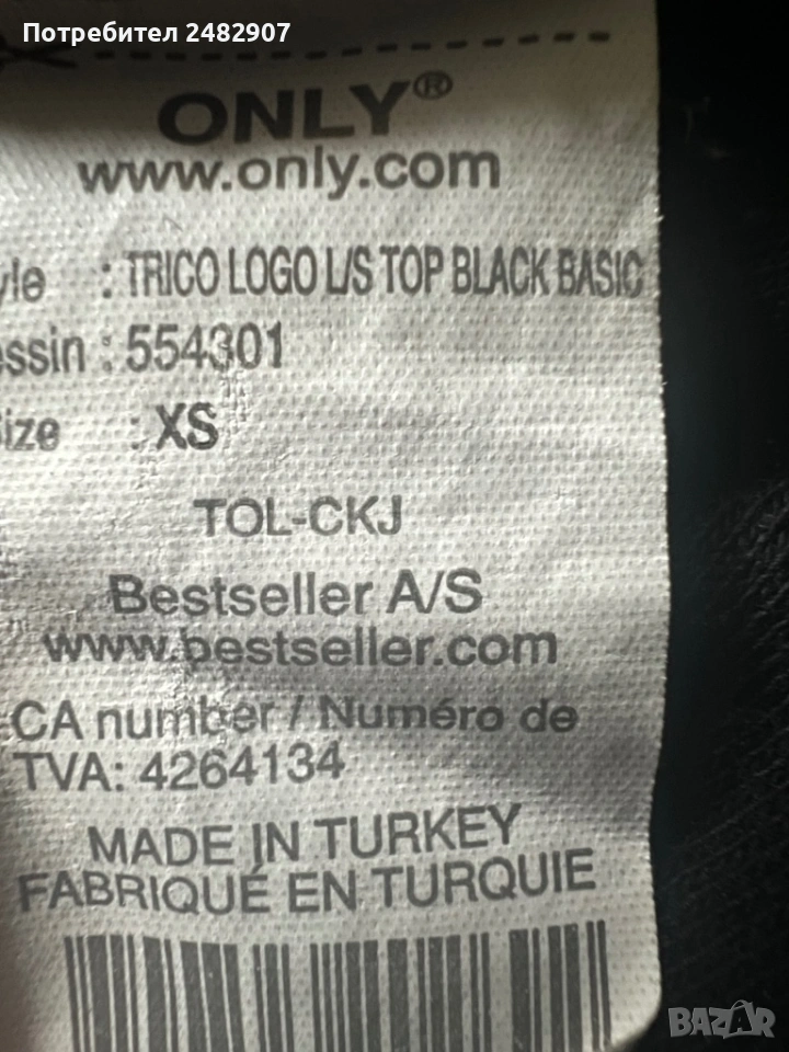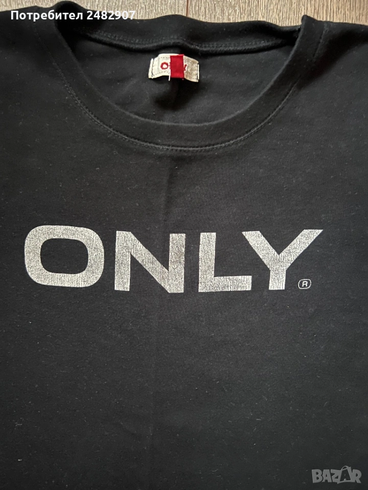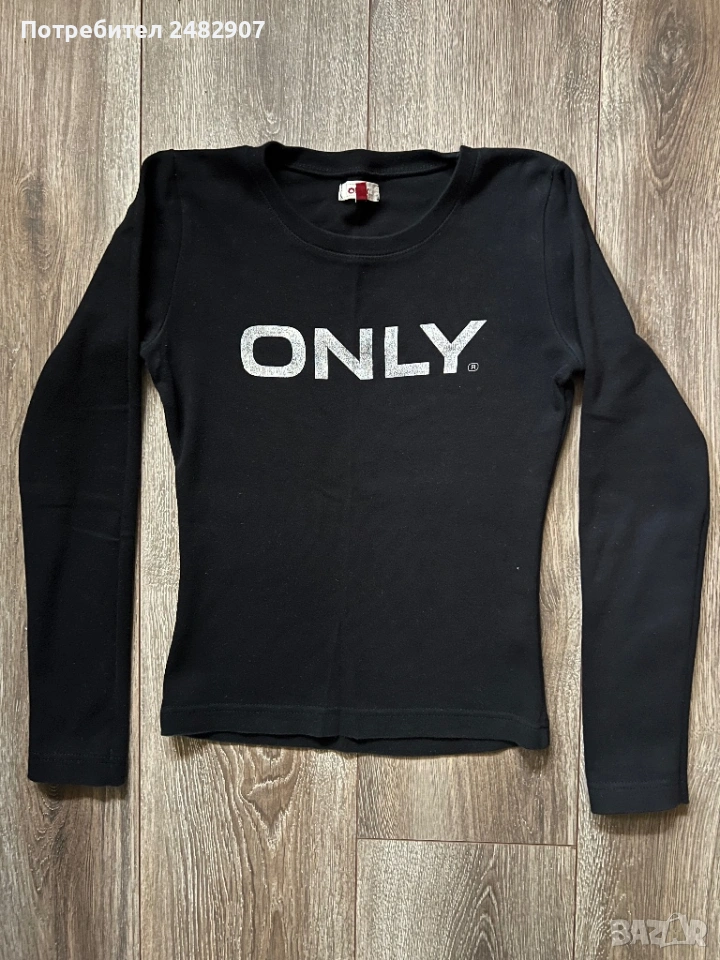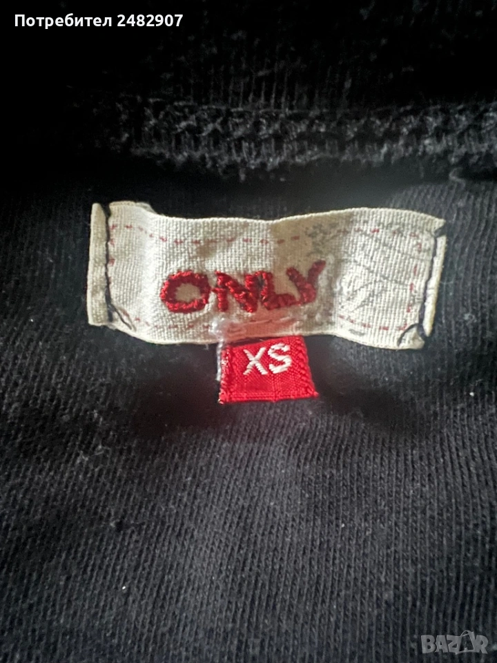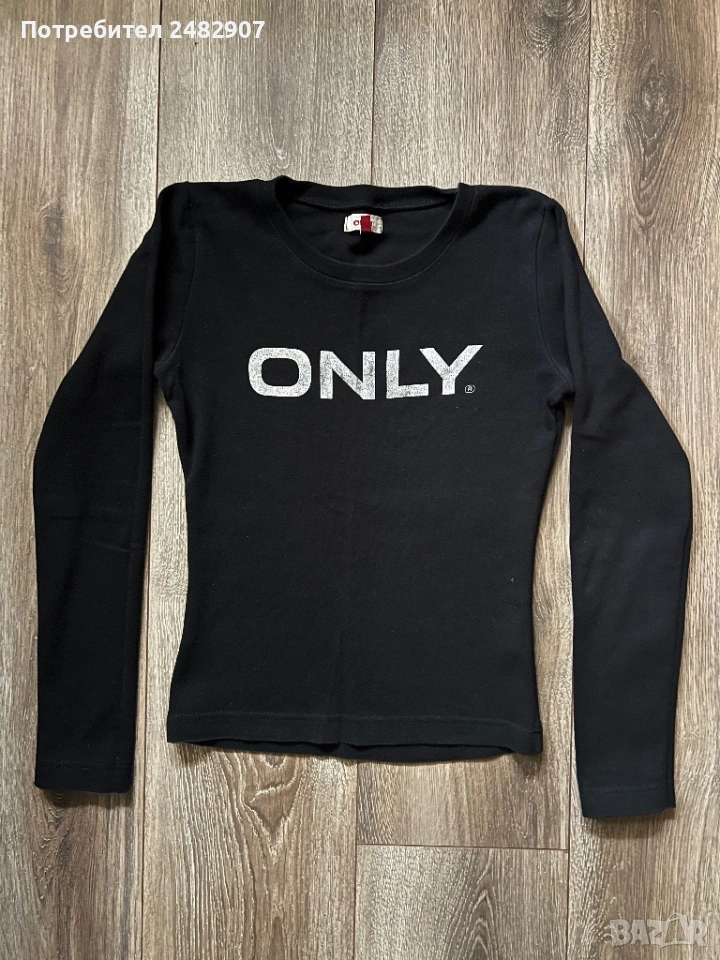 Черна дамска блуза с щампа, размер XS. Ширина в раменете - 33 см, ширина под мишниците - 40 см, ширина в долната част - 36 см, дължина от рамото до долу - 51 см, дължина на ръкава от рамото - 57 см, ширина на ръкава в долната част - 9 см. Много запазена, почти не е използвана.