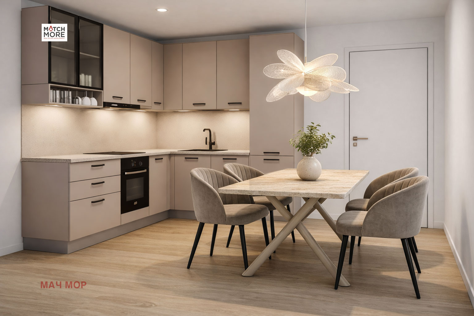Заложена е модерна италианска кухня, съчетаваща изчистен дизайн и практичност. Пространството е оборудвано с електроуреди ELMARK, които осигуряват надеждност и удобство в ежедневието.