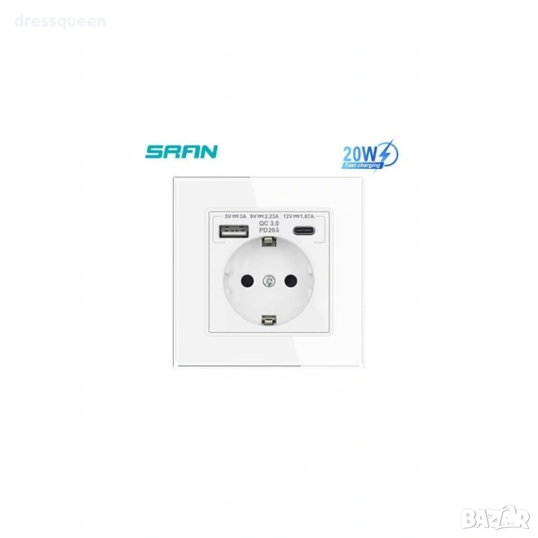 Бързо Зареждане с Type-C: Електрически Контакт с 20W USB Портове (Бял Стъклен Панел)