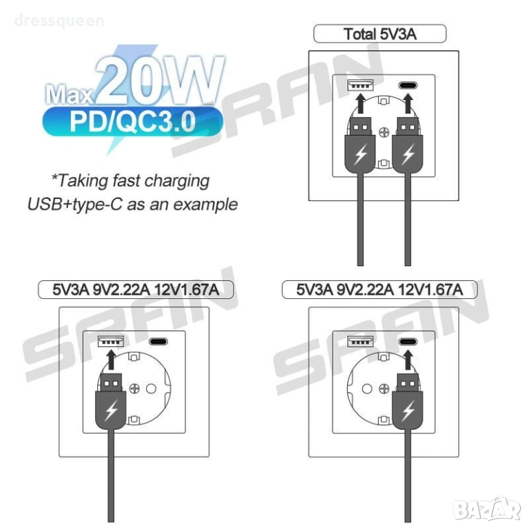 Практически Предимства:USB A + Type C: Перфектна комбинация от двата най-разпространени USB стандарта, осигуряващи изходен ток до 2.1A.