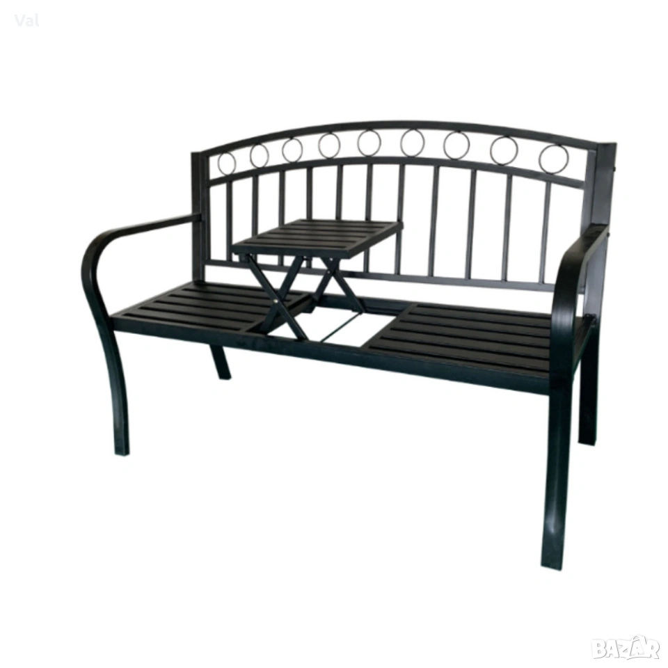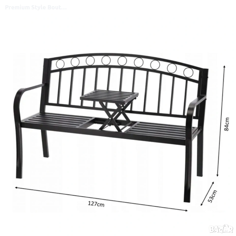 Градинска пейка 2 в 1 с разтегателна маса - удобство и функционалност Ясни и практични спецификации, които правят избора на лесен и сигурен: Размери: дължина 127 см, дълбочина 53 см, височина 84 см. Материал: здрава стоманена конструкция с устойчиво покритие. Цвят: черен, универсален и стилен. Максимална товароносимост: 150 кг. Функция: разтегателна централна масичка с лесен механизъм за вдигане и спускане. Приложение: подходящо за градина, тераса, балкон или зона за отдих.