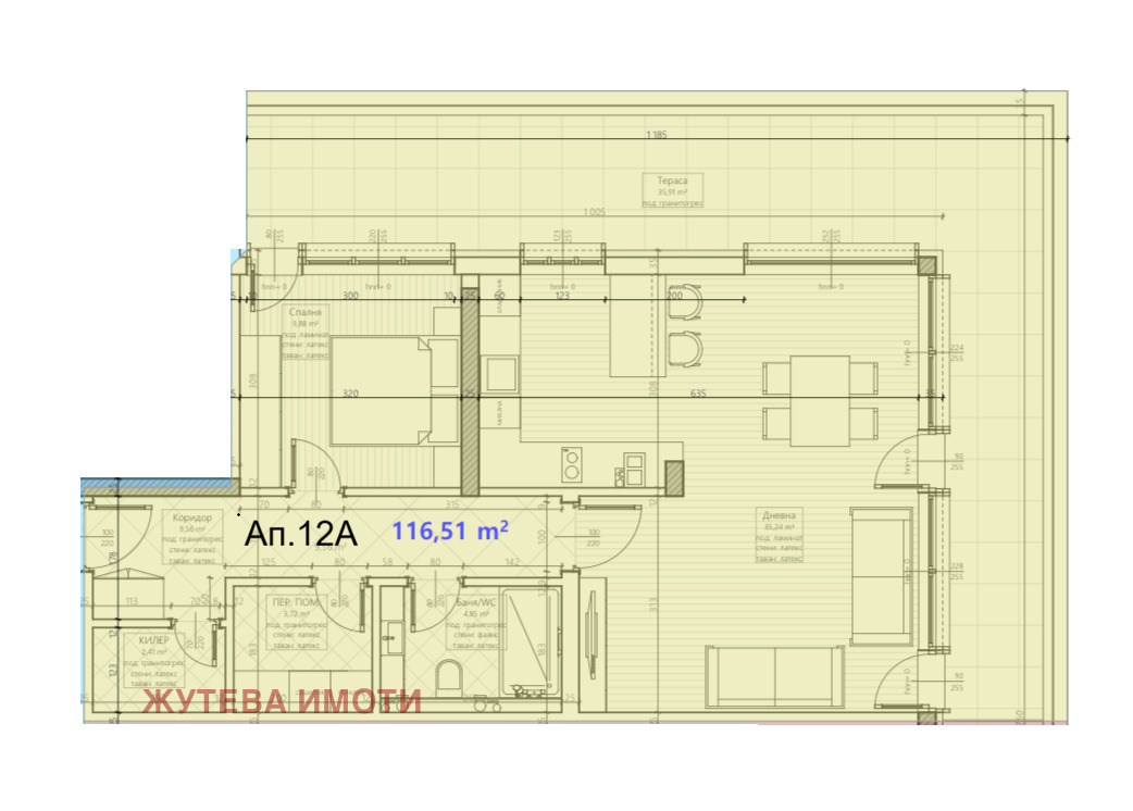 Дневната е просторна с чиста площ 35 кв.м.
