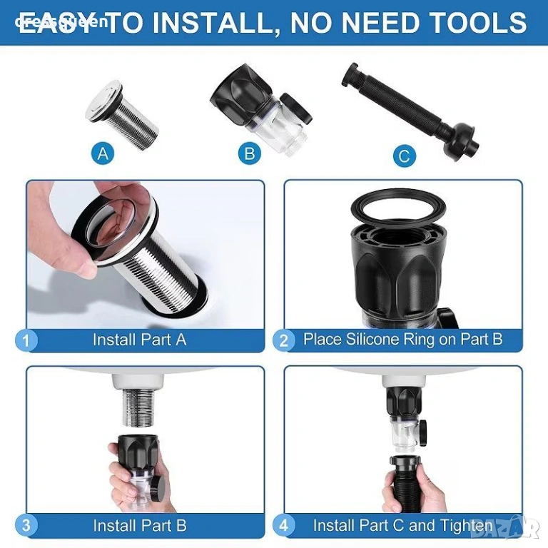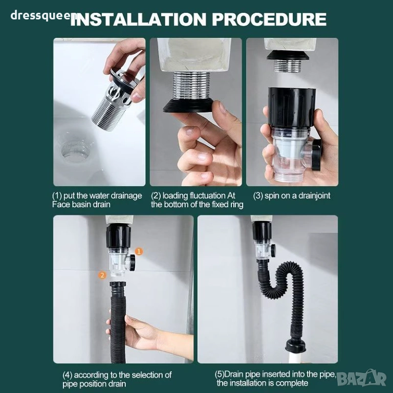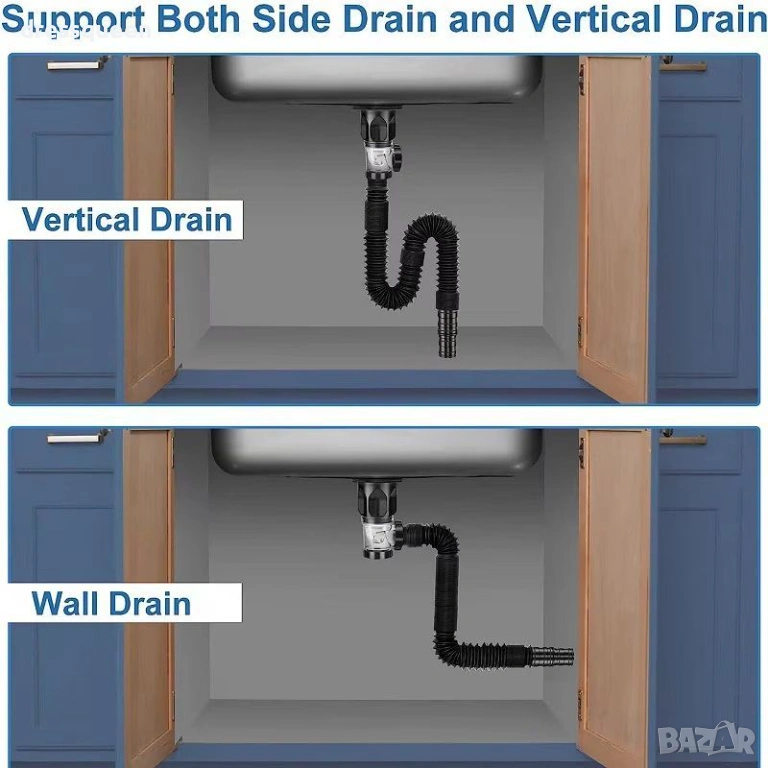 Сифонът е проектиран с гъвкава тръба, което улеснява адаптирането му към различни конфигурации и пространствени ограничения под мивката. Предлага се в два цвята (черен и бял), като черният модел добавя модерен акцент в банята или кухнята. Комплектът включва и POP-UP клапан, който позволява лесно затваряне и отваряне на отвора.