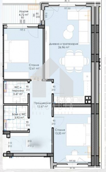 Разпределението е следното: входно антре 13 кв.м, просторна дневна с кухненска част 30 кв.м, две самостоятелни спални по 13 кв.м, баня с тоалетна, втора тоалетна и тераса, на която се излиза от двете стаи. Към имота има избено помещение с площ 1.78 кв.м.