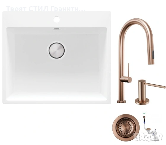 гранитна мивка, бяла кухненска мивка, мивка за кухня, мивка riga 60, меден смесител, кухненски смесител, дозатор за кухня, кухненски аксесоари, комплект мивка смесител, модерна кухня.