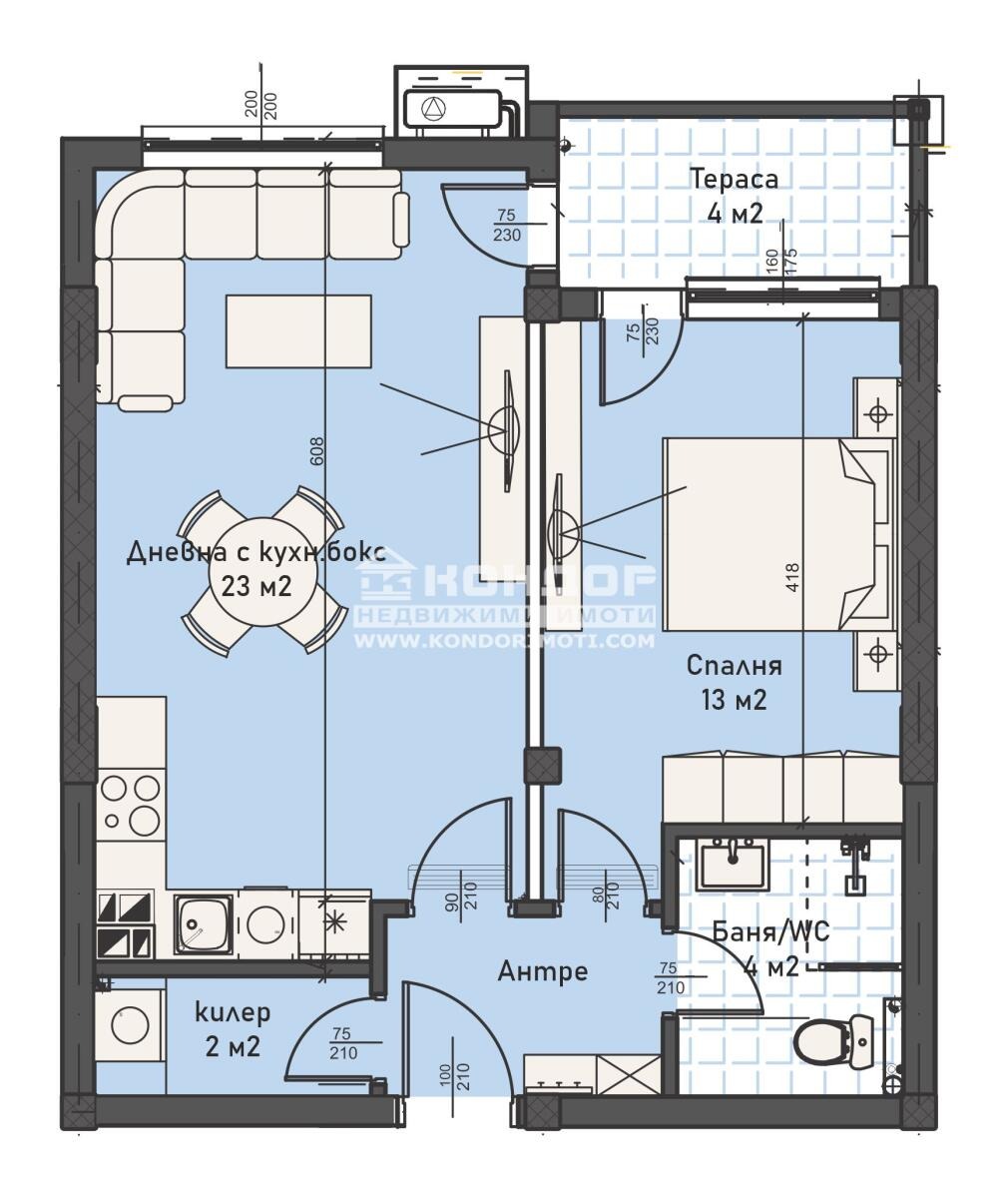 Оферта 68977 - Бутиков затворен жилищен комплекс с модерна и устойчива архитектура, потопена в богато озеленени площи, вдъхващи на живущите комфорт и спокойствие. Комплекса предлага просторна спокойна среда с бърз достъп до центъра на града, както и възлови булеварди. Предлагаме ви двустаен вътрешен апартамент, състои се от дневна 23кв.м. с трапезария и кухненска част, самостоятелна спалня 13кв.м., баня с тоалетна, входно антре с място за гардероб, килер/перално и една обща тераса. В близост са ситуирани ресторанти, хипермаркети, училища и детски градини. Луксозни общи части с предоставено облагородено дворно място, пейки за отдих и детски площадки за игра.