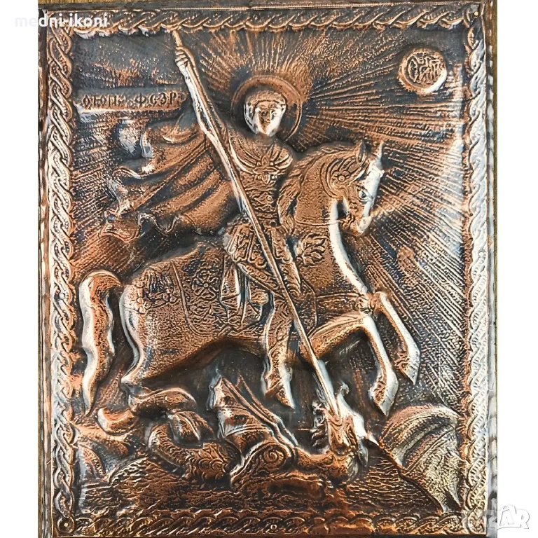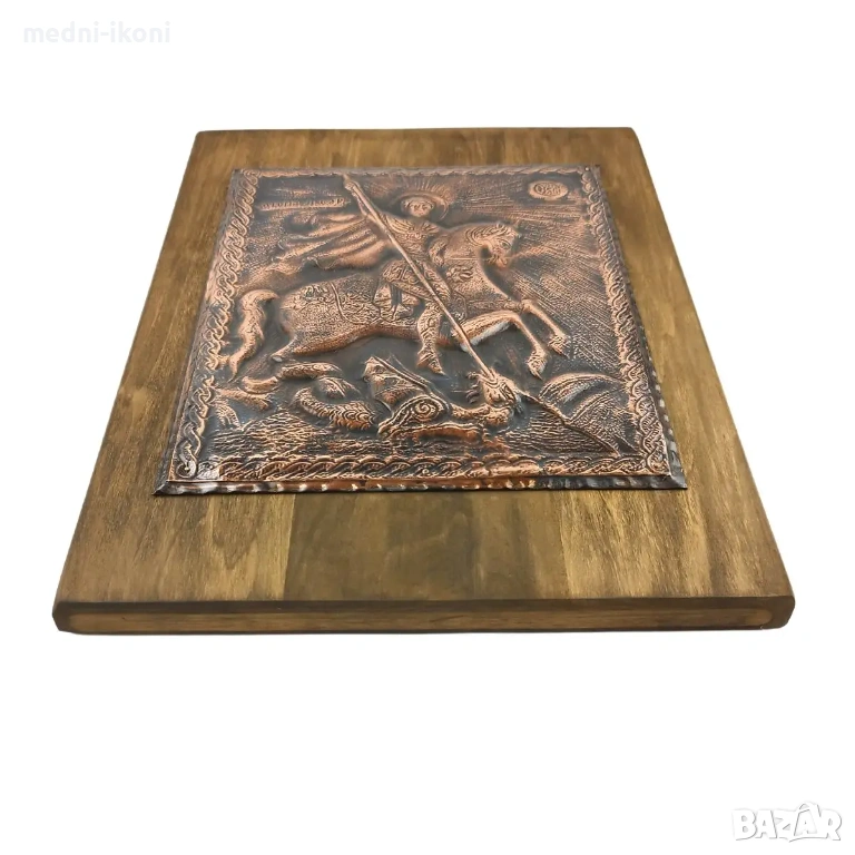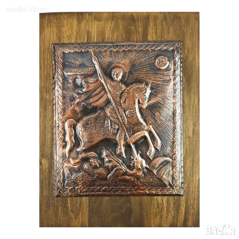 Иконата е ръчно изработена от чиста медна ламарина. Сложена е върху дъска от липа, която е небоядисана и обработена с огън. Тази икона е художествена репродукция на средновековна православна икона. На нея е изобразен Свети Ввликомъченик Георги Победоносец,в традиционното си войнско облекло, на кон, а в краката му лежи убитият от него змей. Свети Георги е един от най-почитаните светци. Той е войн, извършил много чудеса и загинал мъченически за Христовата вяра. Смята се за покровител на българският народ, на военнослужещите и техните семейства, на смелите мъже, пастирите и земеделците. Тази икона е подходящ подарък за имен ден, рожден ден, сватба, кръщене и бизнес партьори. Символизира храбростта и борбеният дух, пази дома от зли сили и лоша енергия.