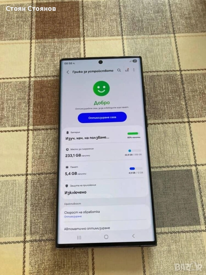 Samsung Galaxy S22 Ultra 256GB Всичко по телефона работи отлично! Отключен към всички оператори Нормални следи от употреба -Комплект - зарядно Възможно лично предаване в Пазарджик на удобна за Вас локация! -Перфектен за подарък! -Възможен бартер. Памет - 256GB Цвят - Зелен Цена: 230 Евро / (Цена за бартер 250евро) Цената е крайна! Работя с еконт за цялата страна с преглед и тест. При интерес, МОЛЯ обадете се, на съобщения не винаги мога да отговарям