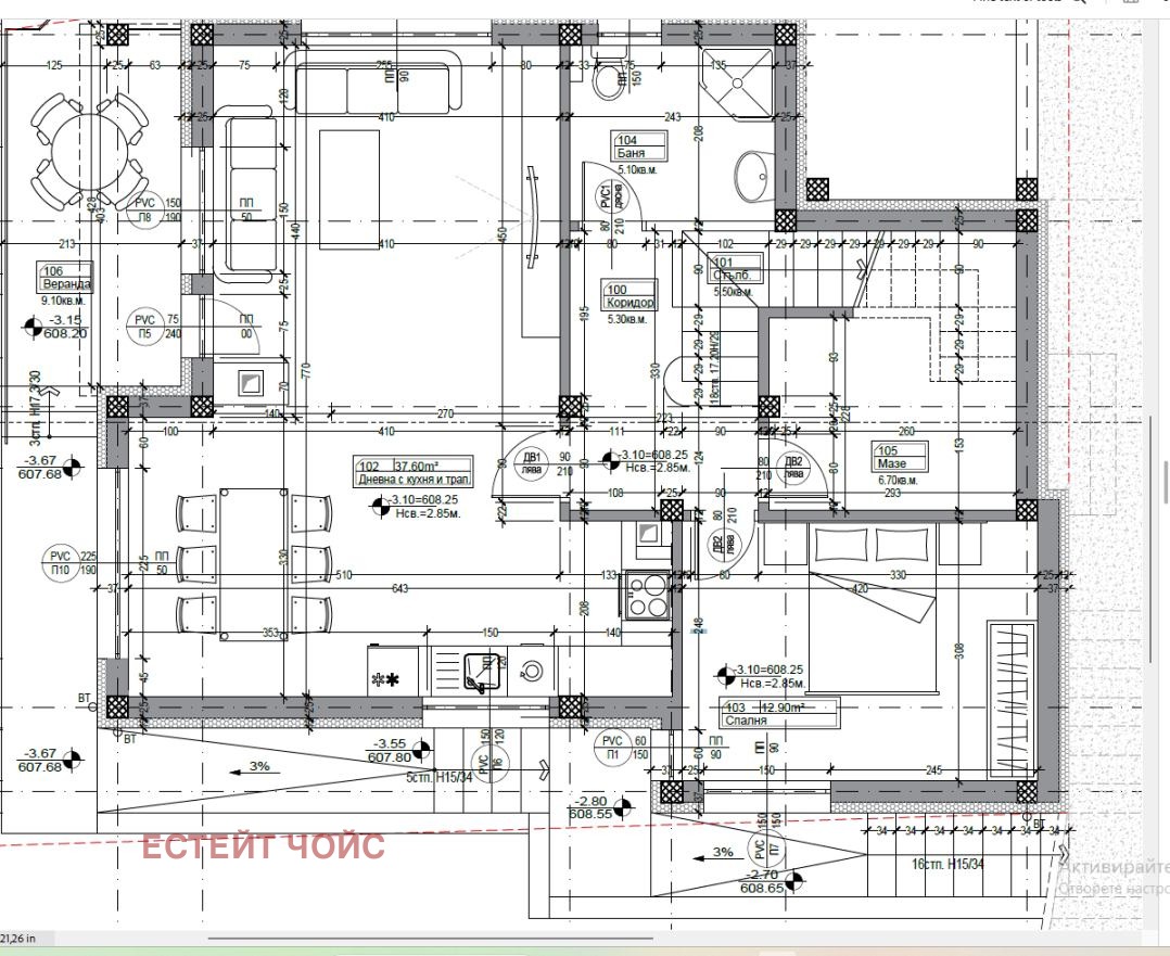 🏠 Еднофамилна къща Застроена площ: 107.20 кв.м Разгъната застроена площ: 202.40 кв.м Височина до 10 м Предвидена веранда 2 паркоместа в имота Над 67% озеленена площ