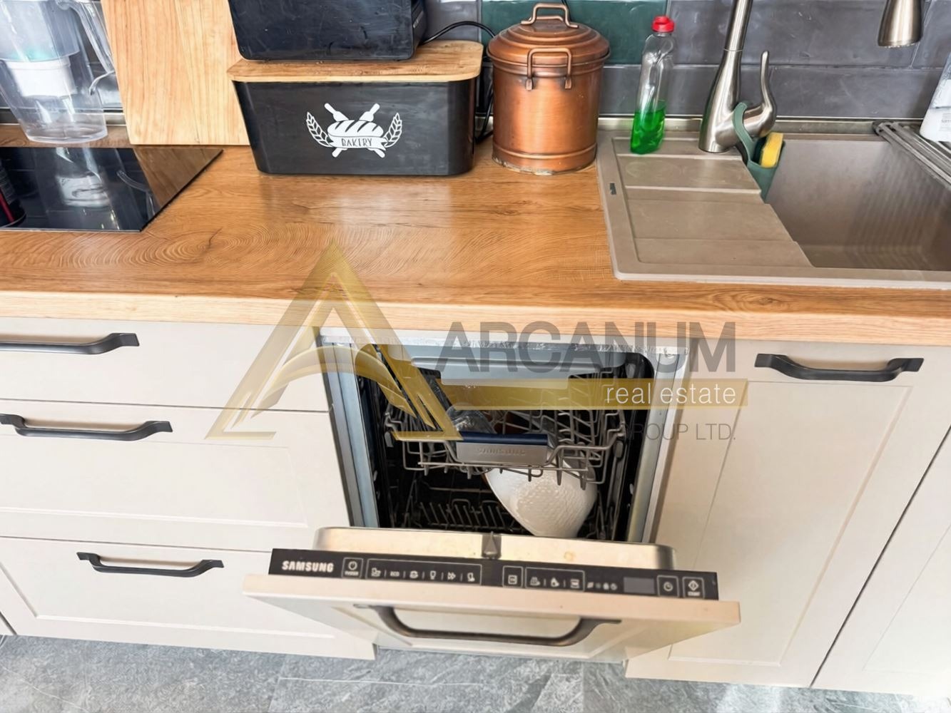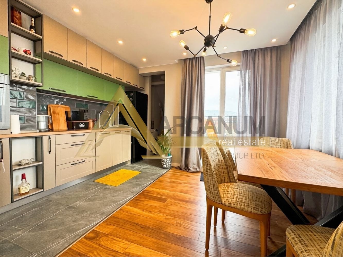 Жилището е просторно, светло и ново, разположено в централната част на квартала. Апартаментът разполага с панорамна тераса с впечатляваща гледка към морето, която създава усещане за простор и комфорт. Предлага се напълно обзаведен с качествени мебели и висок клас електроуреди, готов за незабавно нанасяне.