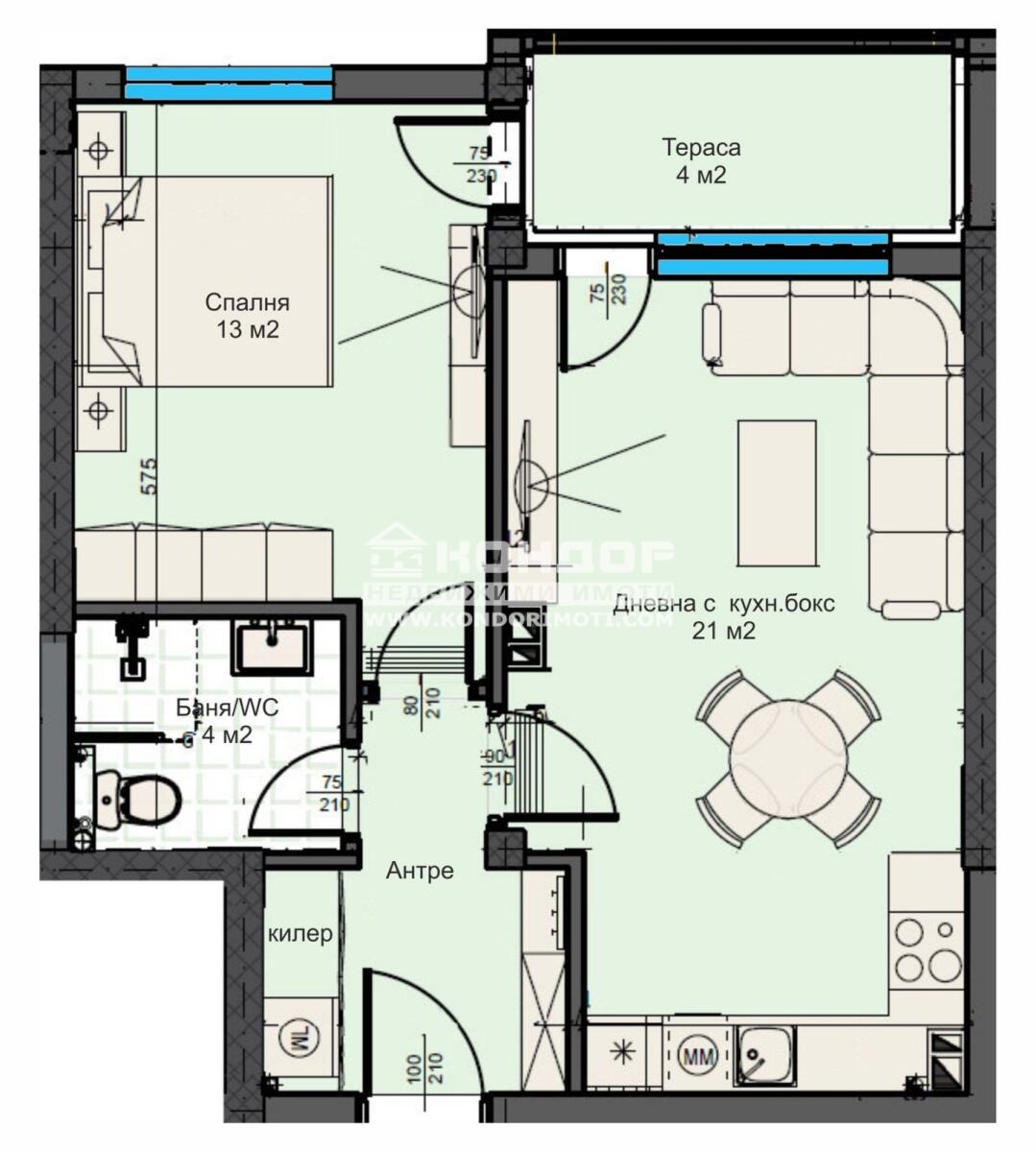 Оферта 68976 - Бутиков затворен жилищен комплекс с модерна и устойчива архитектура, потопена в богато озеленени площи, вдъхващи на живущите комфорт и спокойствие. Комплекса предлага просторна спокойна среда с бърз достъп до центъра на града, както и възлови булеварди. Предлагаме ви двустаен апартамент, състои се от дневна 21кв.м. с трапезария и кухненска част, самостоятелна спалня 13кв.м., баня с тоалетна, входно антре с място за гардероб, килер/перално и една обща тераса. В близост са ситуирани ресторанти, хипермаркети, училища и детски градини. Ще бъдат изградени луксозни общи части с предоставено облагородено дворно място, пейки за отдих и детски площадки за игра.