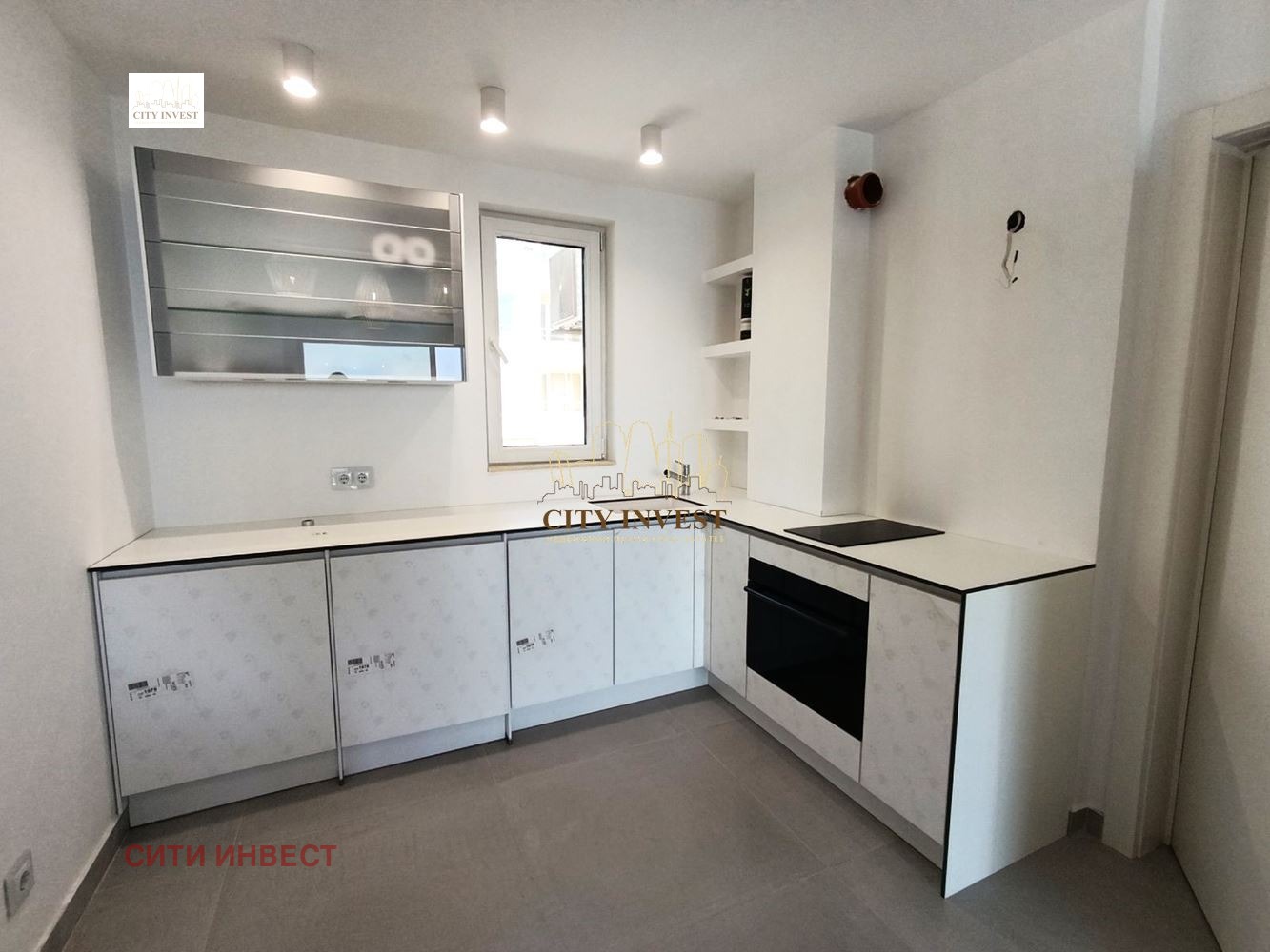 Инсталирана висококачествена кухня с модерни вратички тип ветрило и печка за вграждане с котлони;