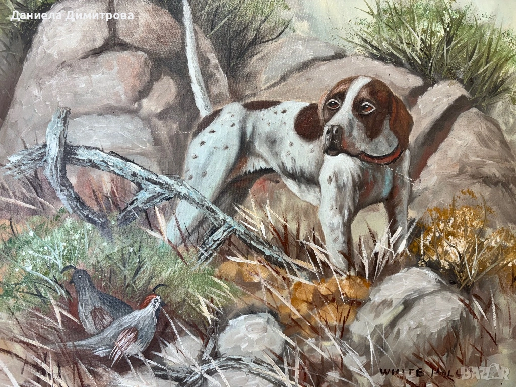 Динамична композиция с ловно куче(пойнтер) и дивеч в естествена среда.