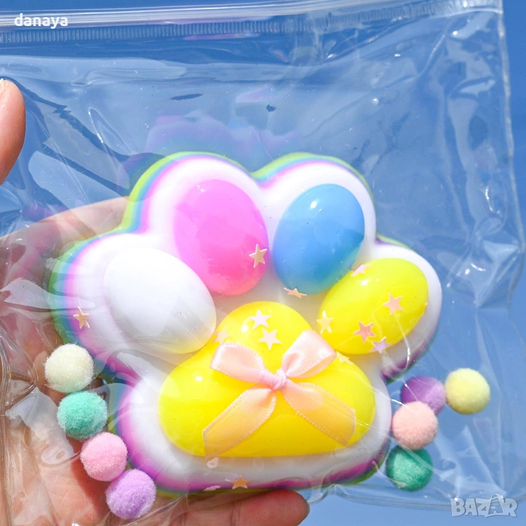 Очарователният дизайн на скуиши лапичка с цветни елементи и пухкави топчета привлича вниманието още от първия момент. Тя е компактна и удобна за носене навсякъде – в раница, чанта или джоб, така че любимата антистрес играчка винаги да бъде под ръка.