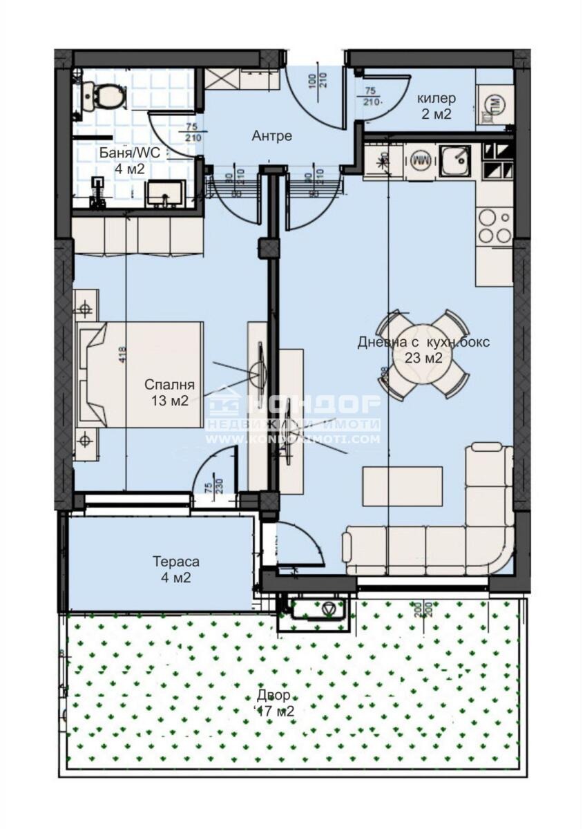 Оферта 68973 - Бутиков затворен жилищен комплекс с модерна и устойчива архитектура, потопена в богато озеленени площи, вдъхващи на живущите комфорт и спокойствие. Комплекса предлага просторна спокойна среда с бърз достъп до центъра на града, както и възлови булеварди. Предлагаме ви жилище, което се състои от дневна 23кв.м. с трапезария и кухненска част, самостоятелна спалня 13кв.м., баня с тоалетна, входно антре с място за гардероб, килер/перално и една веранда + двор. В близост са ситуирани ресторанти, хипермаркети, училища и детски градини. Ще бъдат изградени луксозни общи части с предоставено облагородено дворно място, пейки за отдих и детски площадки за игра.