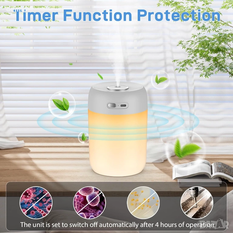 Компактен мини овлажнител за въздух с хладна мъгла, който се презарежда чрез USB и има три режима на нощно осветление (цветна околна светлина, топла светлина за релаксация и червено мигащо предупреждение за изтощена батерия). Предлага двойни опции за мъгла, включително непрекъснато пръскане за постоянна влажност и периодично пръскане за по-ефективна употреба. Проектиран за тиха работа под 28 dB, което го прави подходящ за спални, бебешки стаи, офиси и грижа за растения. Преносимият, пестящ място дизайн се побира лесно на бюра или нощни шкафчета, а акумулаторната батерия осигурява над 3,5 часа употреба. Включва удобна конструкция с горно пълнене и автоматично изключване при ниско ниво на водата, осигурявайки безопасна, лесна и надеждна ежедневна работа.