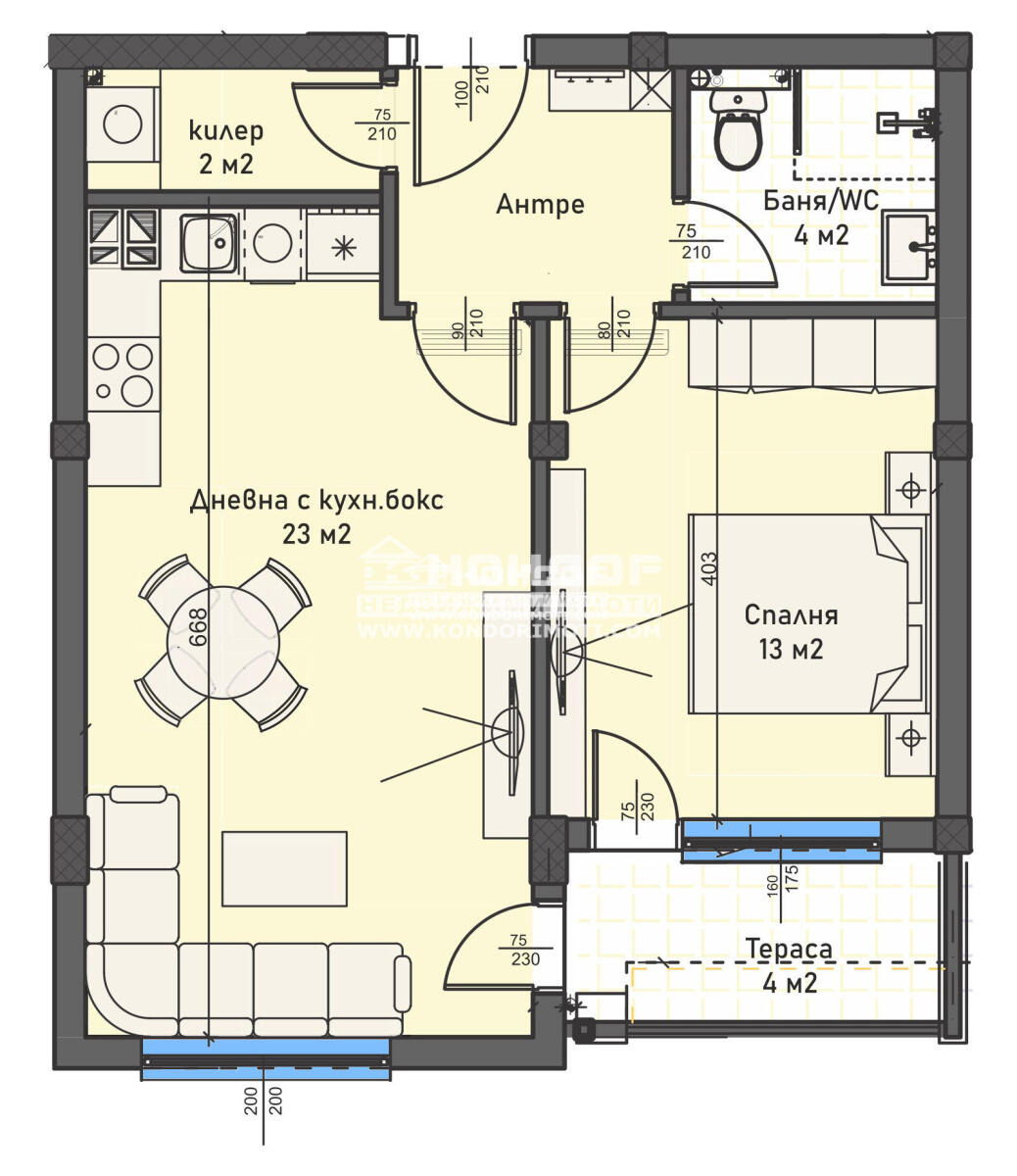 Оферта 68972 - Бутиков затворен жилищен комплекс с модерна и устойчива архитектура, потопена в богато озеленени площи, вдъхващи на живущите комфорт и спокойствие. Комплекса предлага просторна спокойна среда с бърз достъп до центъра на града, както и възлови булеварди. Предлагаме ви двустаен апартамент, състоящ се от дневна 23кв.м. с трапезария и кухненска част, самостоятелна спалня 13кв.м., баня с тоалетна, входно антре с място за гардероб, склад и една обща тераса. В близост са ситуирани ресторанти, хипермаркети, училища и детски градини. Ще бъдат изградени луксозни общи части с предоставено облагородено дворно място, пейки за отдих и детски площадки за игра.