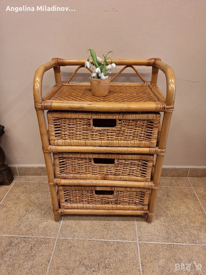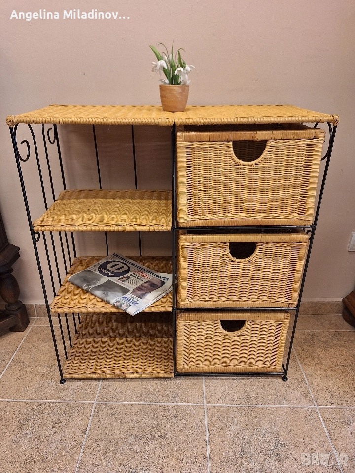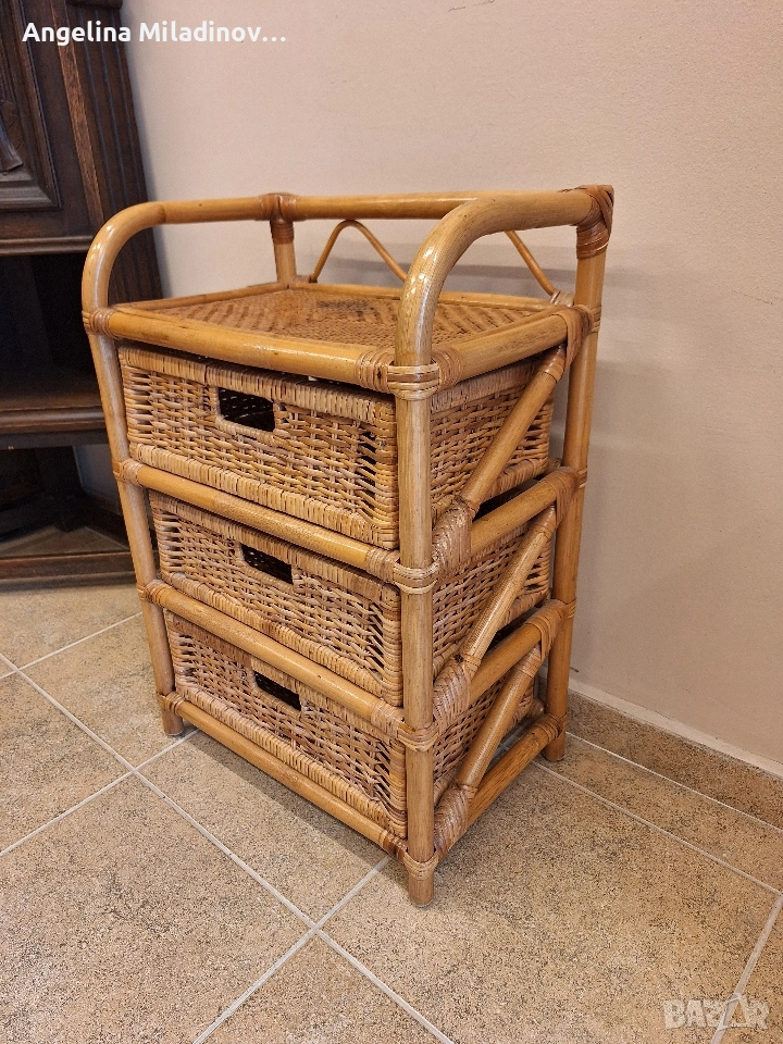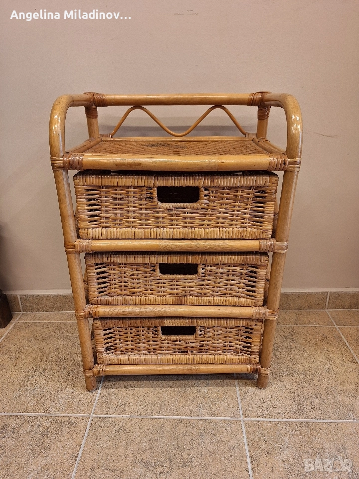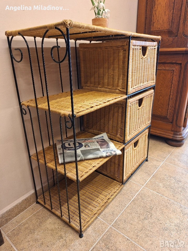 Етажерки и масичка от ратан. 1 - толяма етажерка от изкуствен ратан - 76/33/85 см. Цена - 70 €, 136,91 лв. 2 - етажерка с чекмеджета от естествен ратан - 46/31/68 см. Цена - 60 €, 117,35 лв. 3 - масичка от естествен ратан - 46/33/50 см. Цена - 20 €, 39,12 лв. Разгледайте и другите ми обяви. Последвайте ни и във фейсбук Мебели шик. vintagemebel.olx.bg