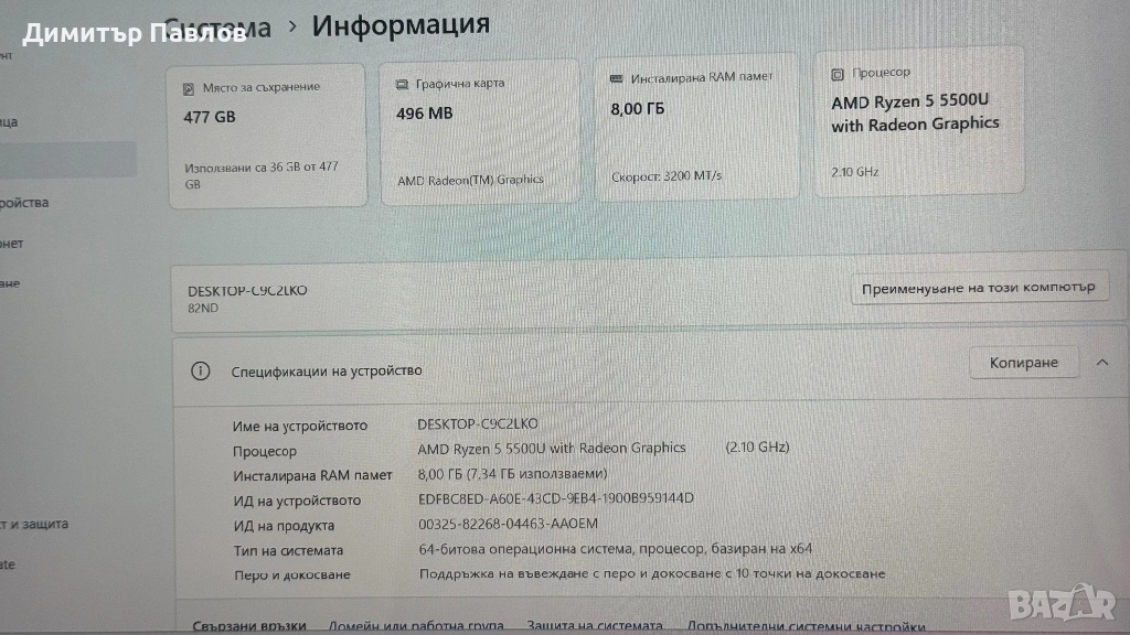 Процесор : AMD Ryzen 5 5500U - 6 ядра, 12 нишки с честота до 4GHZ