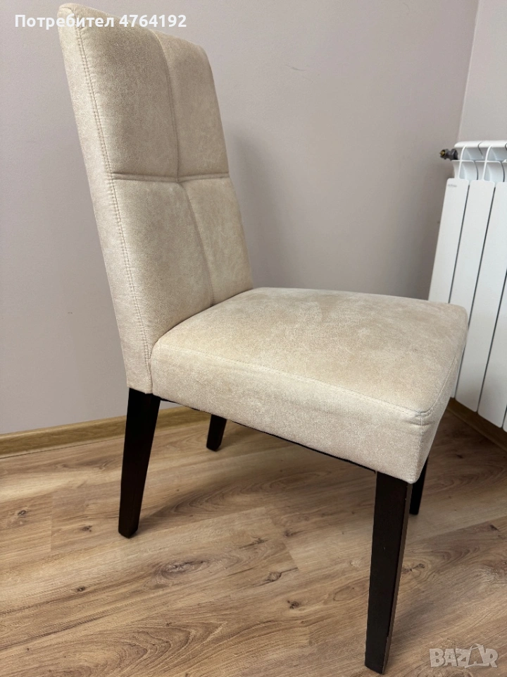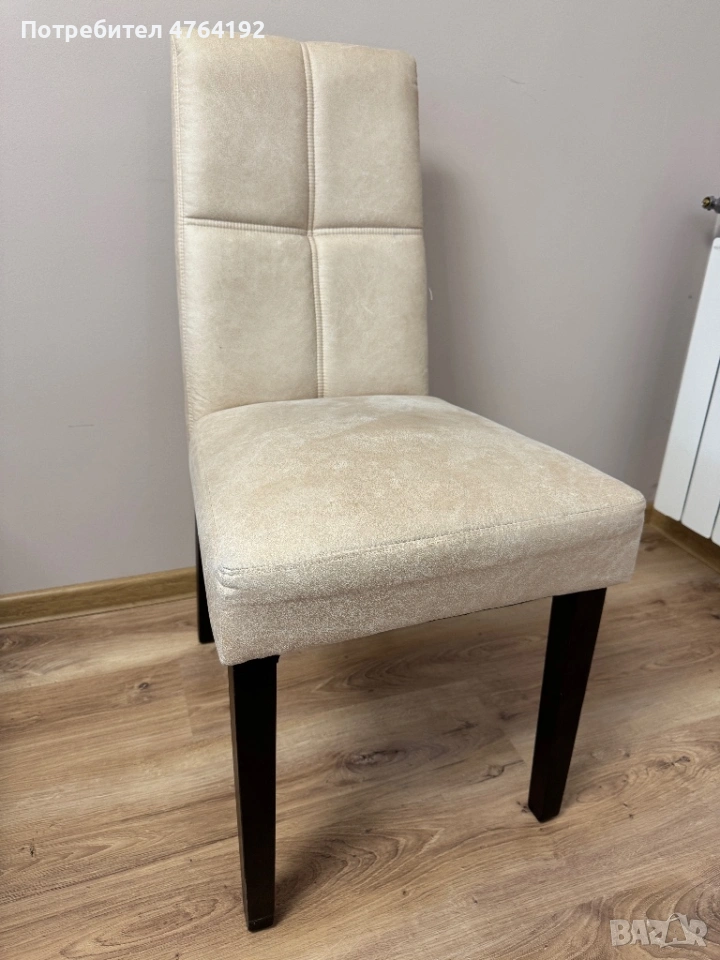 трапезен стол, закупен от Мебели Виденов. Столът е много запазен, стабилен и удобен. Тапицерията е в бежов цвят, лесно се съчетава с различни интериори. Краката са тъмни дървени (венге), здрави и без разклащане.