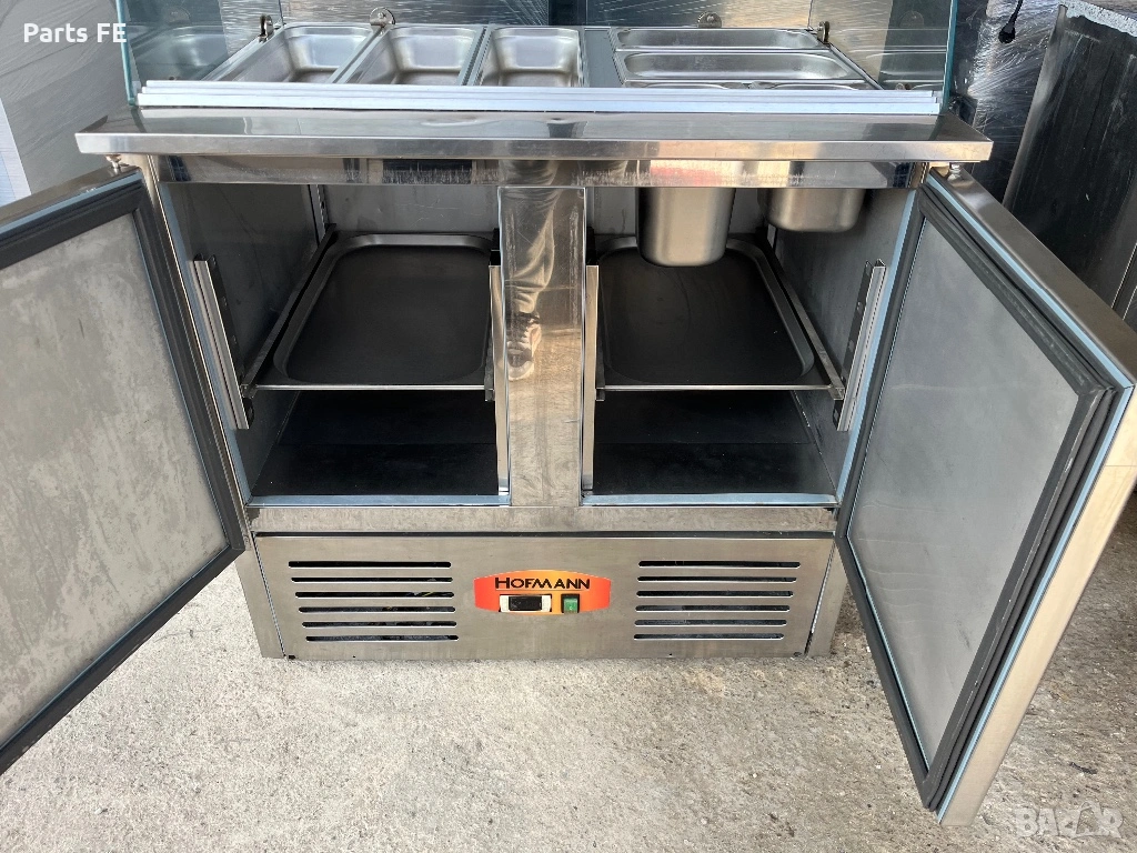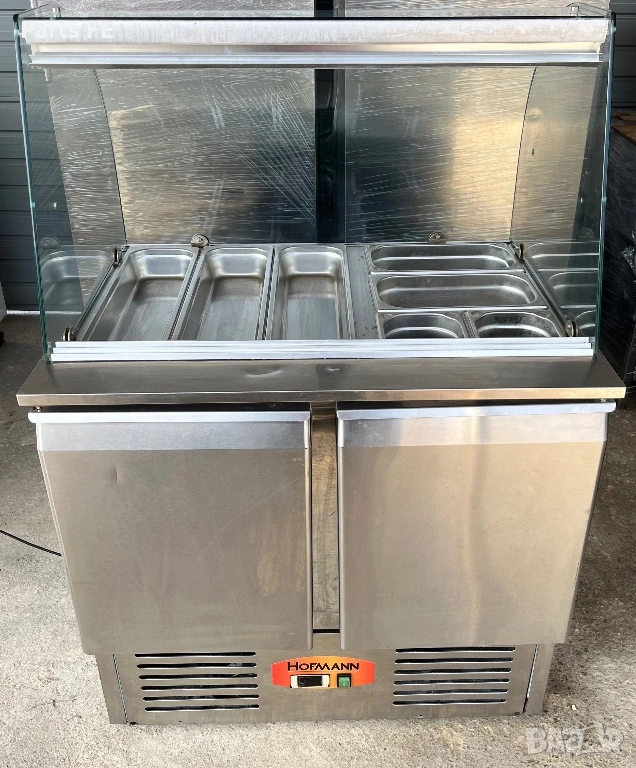 Професионална хладилна витрина маса “Hofmann”. Монофазен уред с мощност 155W. Размери: В85см (135см със стъклата), Ш90см, Д70см. Размера на рафта е за 1/1ГН. Възможност за ползване без стъклата, като саладета. В наличност са и други професионални уреди за ресторанти и заведения. За повече информация моля позвънете.