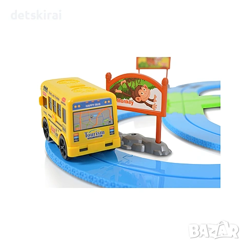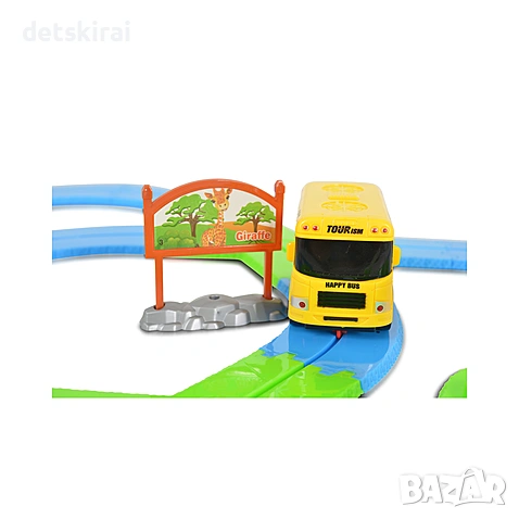 Направете най-вълнуващата разходка в зоопарка у дома! Веселото автобусчето говори и пее на български език. Изпозвайте въображението си и може да сглобите своя оригинална писта - зоопарк с наличните елементи. Автобусът има светещи фарове. Интелигентно разпознаване на спирките. Играчката е със светлинни и звукови ефекти. Занимателната и образователна игра има с две функции. Лесна за сглобяване, съхранение и пренасяне.