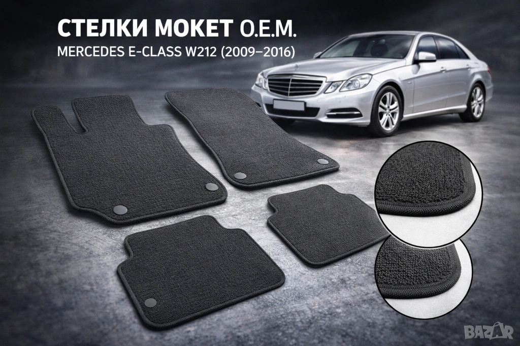 Висококачествени мокетни стелки за Mercedes W212 (E-Class), създадени специално за перфектно пасване към пода на автомобила.