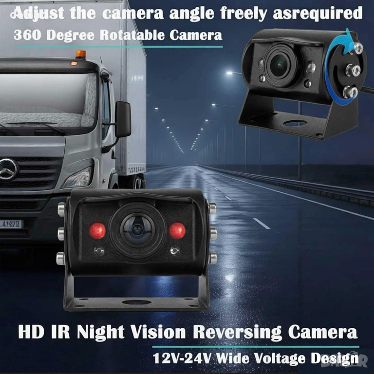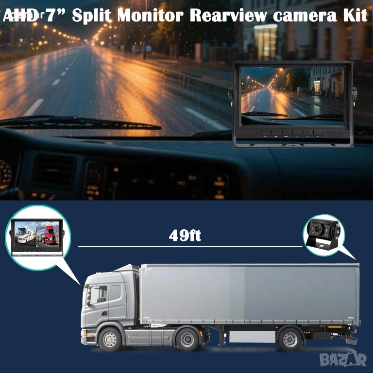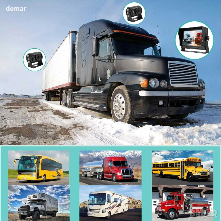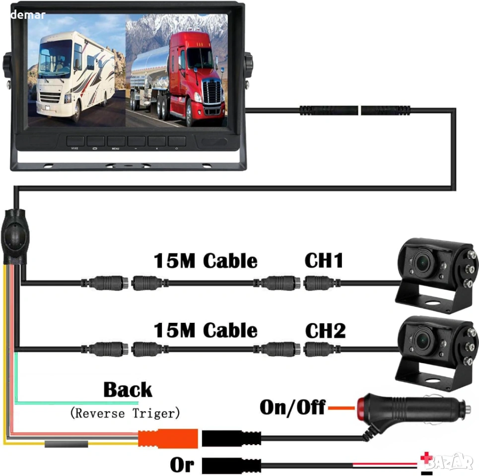 Кабелна AHD система с камери за заден ход със 7-инчов IPS 1080P монитор с двоен разделен екран за едновременно гледане на две камери. Включва две AHD камери и два 15-метрови 4-пинови удължителни кабела за стабилно предаване на сигнала без смущения в сравнение с безжичните системи. Мониторът осигурява ясни, ярки изображения и намалява напрежението в очите по време на дълги шофирания. Камерите са с водоустойчива защита IP69K и нощно виждане за надеждна видимост при дъжд, тъмнина и всякакви метеорологични условия, с превключващо огледало или нормално изображение за използване като предно или задно виждане. Проектирана за превозни средства 12V–24V, като камиони, кемпери, ремаркета, автобуси, пикапи, кемпери, SUV и микробуси. Plug-and-play инсталацията с едно захранване и сигурни 4-пинови авиационни конектори осигурява стабилна работа и лесна настройка.