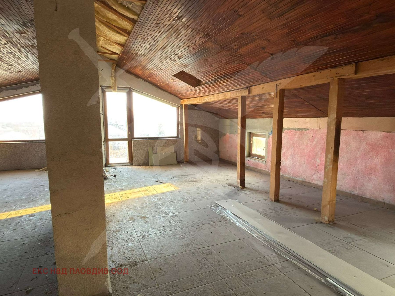 РАЗПРЕДЕЛЕНИЕ: Сградата е с лице към две улици и разполага с двор от 1260кв.м., два гаража с дължина 9м., сонда и вътрешно стълбище, което води към втория етаж и таванското. Първият етаж е с входно антре, баня, отделна тоалетна, три спални и санитарен възел, който може да бъде ползван като кухненско отделение. Вторият етаж е с две спални помещения, всекиднева, баня с тоалтна и две тераси.