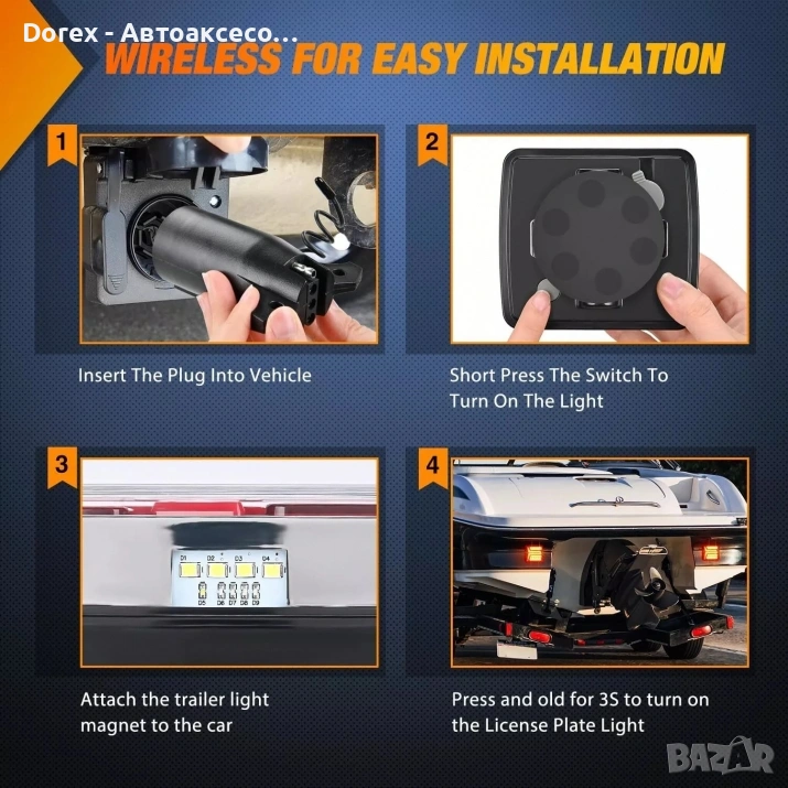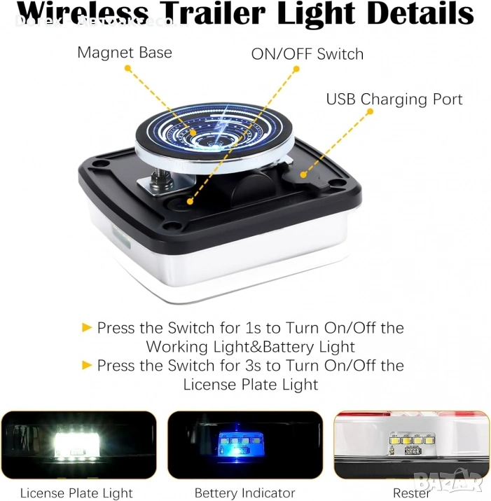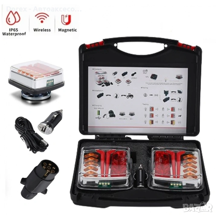 Магнитни мултифункционални безжични светлини с функции стоп, габарит, мигач и светлина за номер. Лесни за монтаж и прехвърляне между превозни средства без инструменти. Акумулаторни, с радиочестотен обхват 30 метра и защита срещу вода (IP65).
