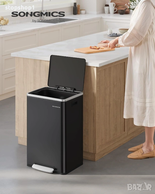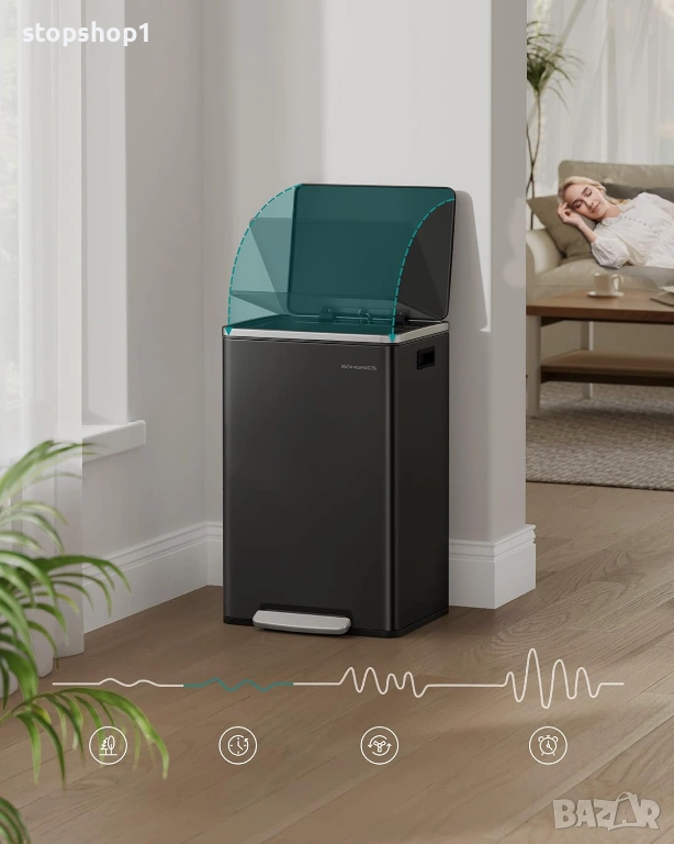 - Обмислени детайли: кошчето е оборудвано с педал за изхвърляне на отпадъците без докосване на капака. Капакът се затваря бавно и тихо, без да издава досаден шум.