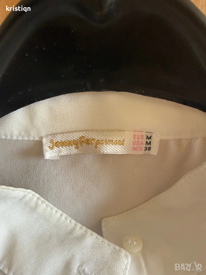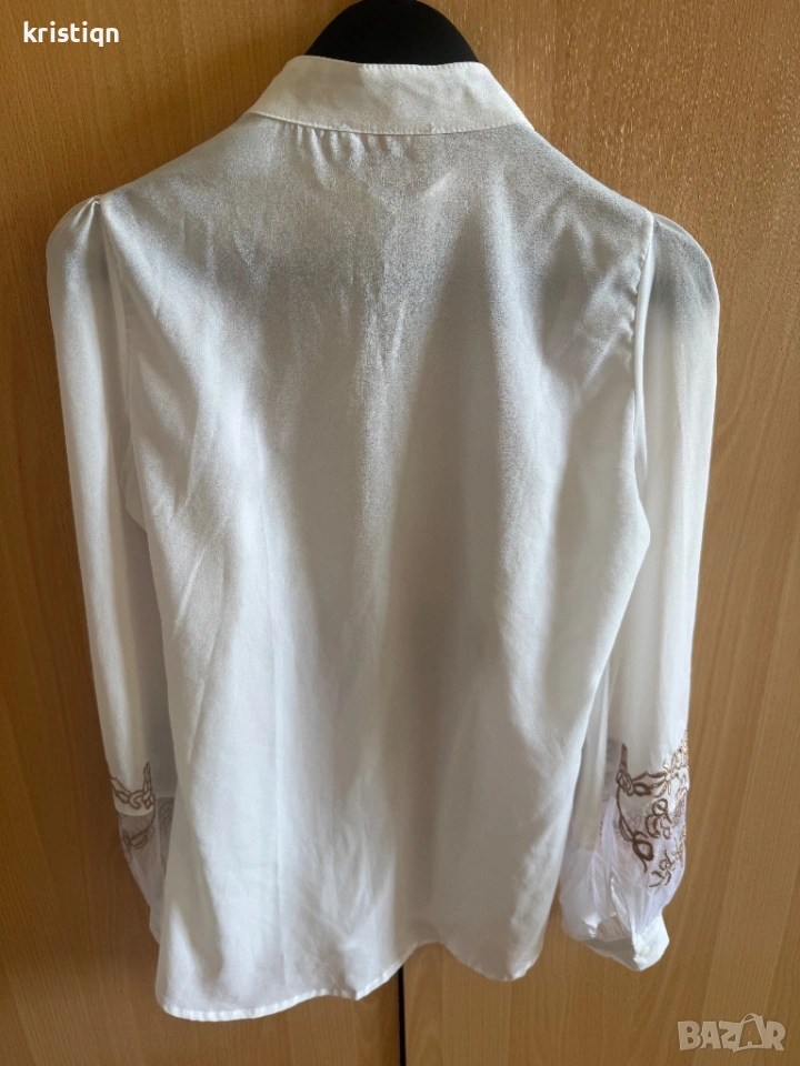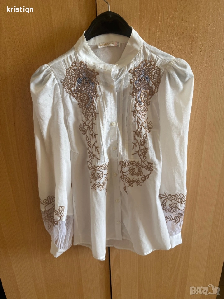 Естествена коприна с бродерия и военна якичка. Отговаря на размер S-М. Подходяща и за панталон с висока талия. Носена за повод без забележки.