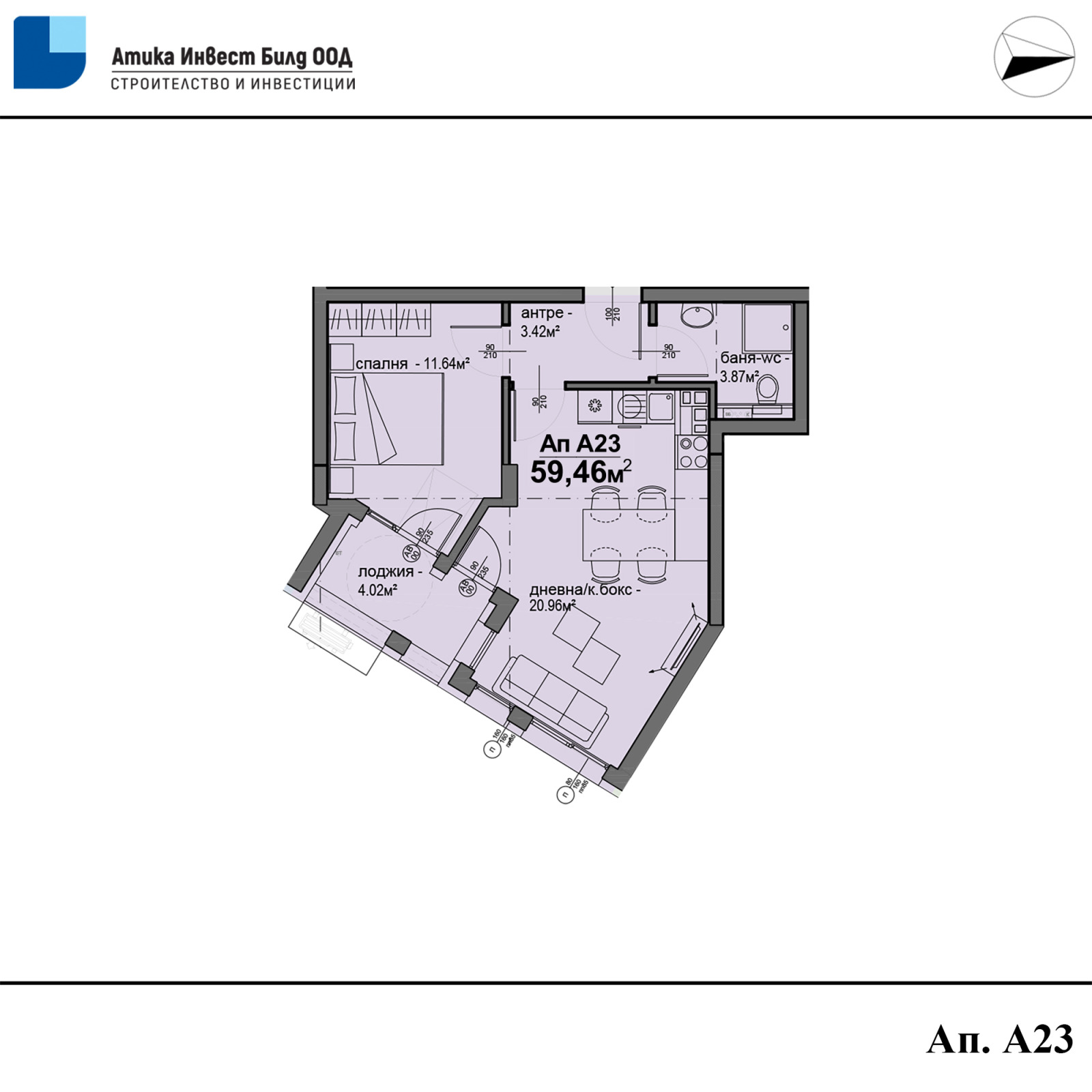 Ап. А23- 59,46 кв.м- 111 800 евро