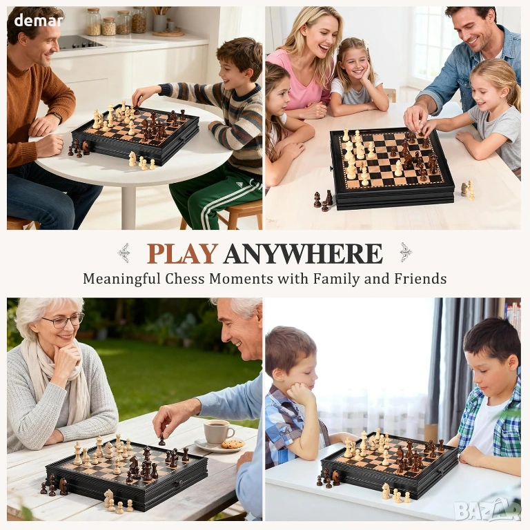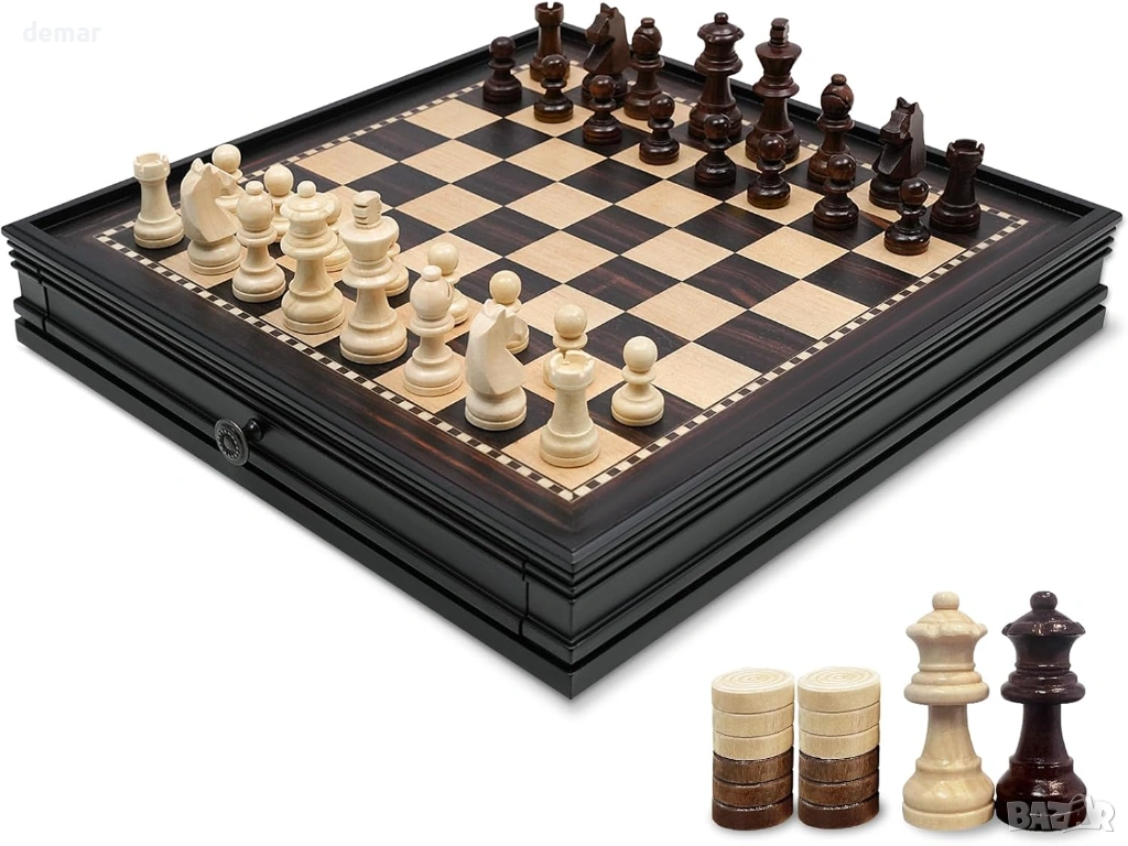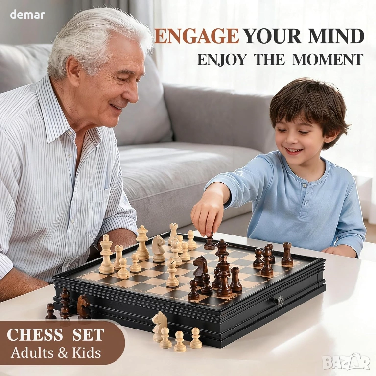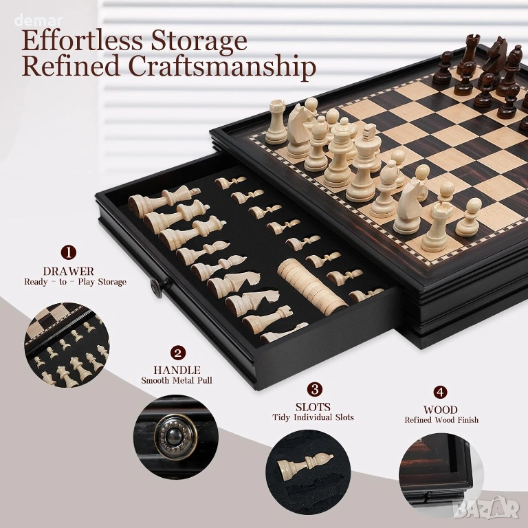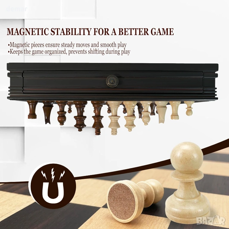 Комплект магнитни дървени настолни игри - шах и пул, включващ класически фигури в стил Стонтън и масивна дъска от твърда дървесина, проектирана за стабилна и плавна игра. Дъската 2 в 1 поддържа както шах, така и пул, което я прави подходяща за възрастни и деца, които учат на стратегия или се наслаждават на семейното време за игра. Тя включва 34 магнитни шахматни фигури с допълнителни дами за повишения, което спомага за поддържане на стабилността на фигурите по време на по-дълги мачове. Дъската е с практичен дизайн с чекмеджета и вградени плъзгащи се отделения за съхранение, позволяващи удобно организиране и защита както на шахматните, така и на пуловите фигури. Изработена от подбрана твърда дървесина, дъската осигурява издръжливост, балансирано тегло и равна игрална повърхност, подходяща за домашна употреба, учебни стаи или ежедневна игра.