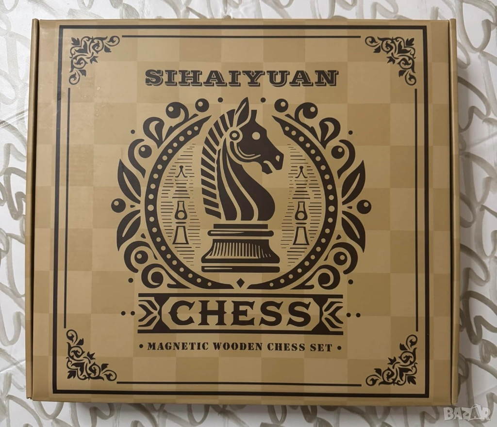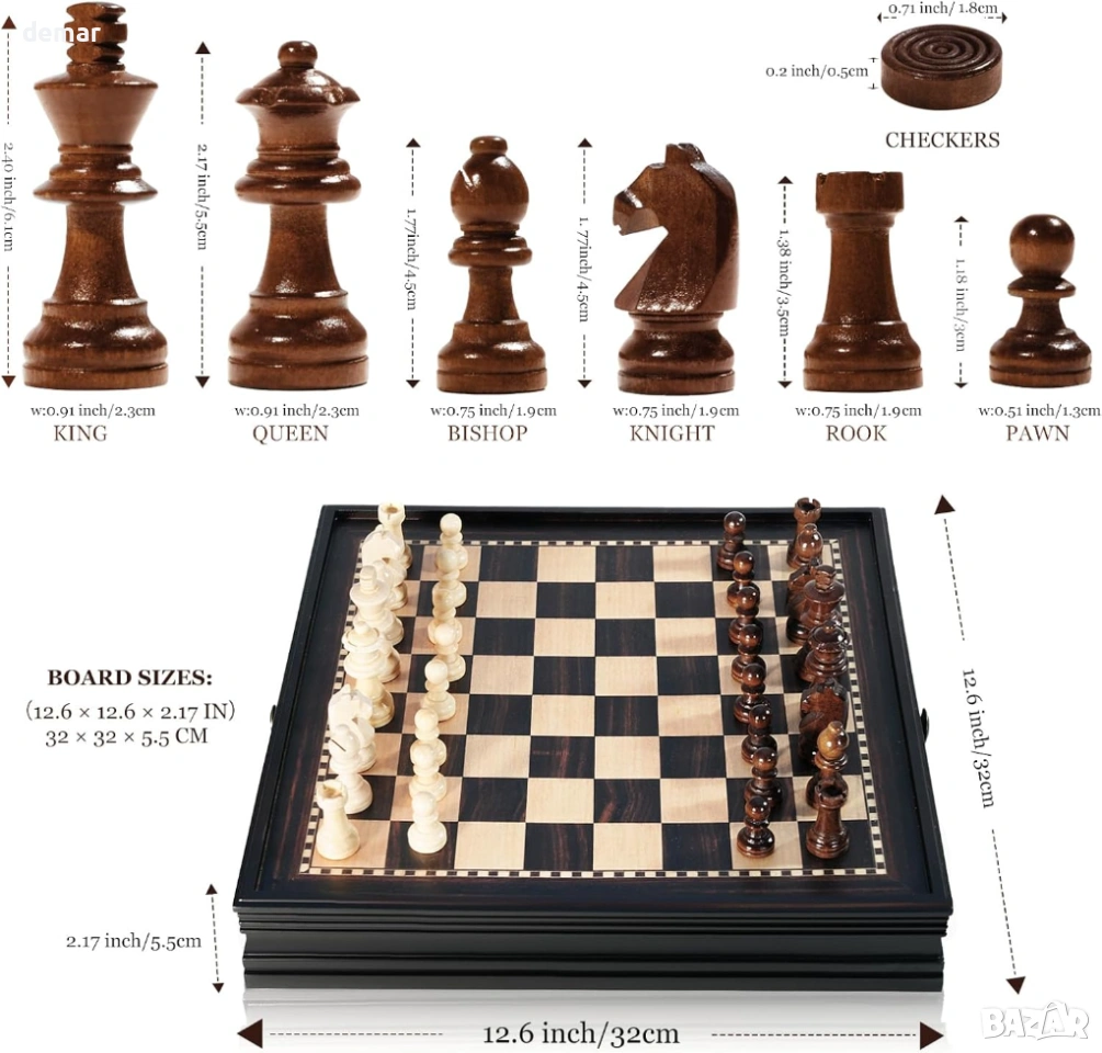 Дървен шахматен комплект магнитен – 2 в 1 шахматна дъска 32 см, 34 фигури Staunton