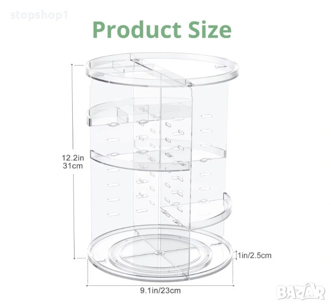 Компактните размери, с дължина 23 см, дълбочина 26 см и височина 31 см, го правят подходящ за всяко пространство за гримиране или тоалетка. Плавното му въртене ви позволява лесно да достигате до всяко отделение, без да нарушавате реда на вашите продукти.