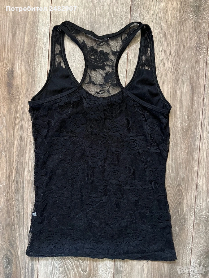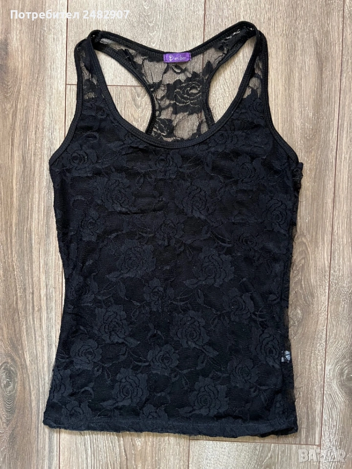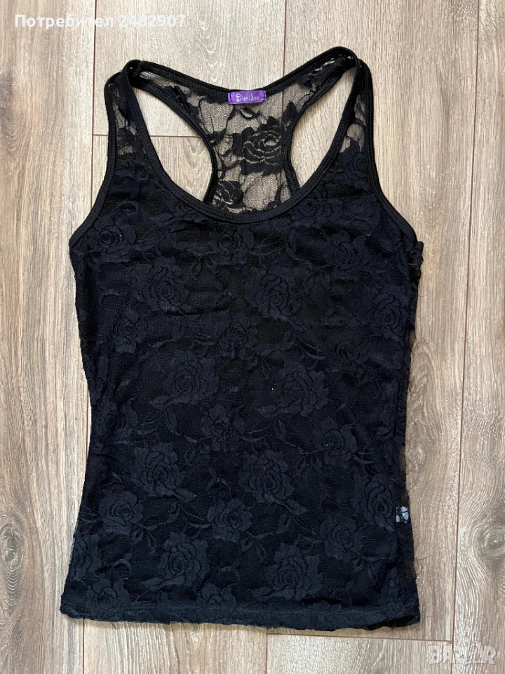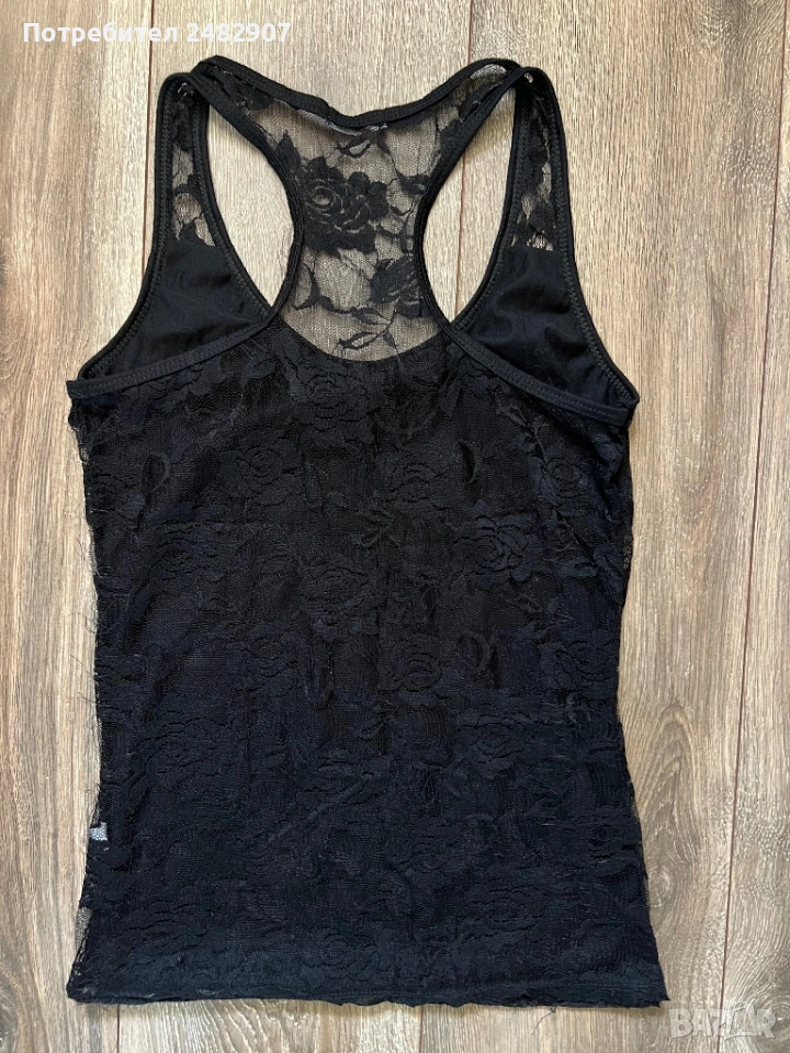 Черен дамски потник - дантела, размер S. Съдържа 65 % памук и 35 % полиестер. Ширина в раменете - 26 см, ширина под мишниците - 37 см, ширина в долната част - 38 см, дължина от рамото до долу - 59 см. Много запазен, почти не е използван, леко еластичен.