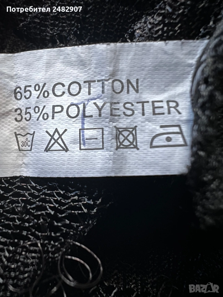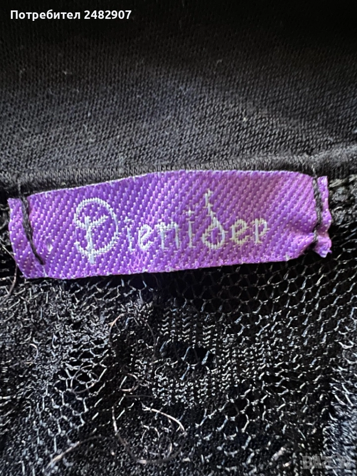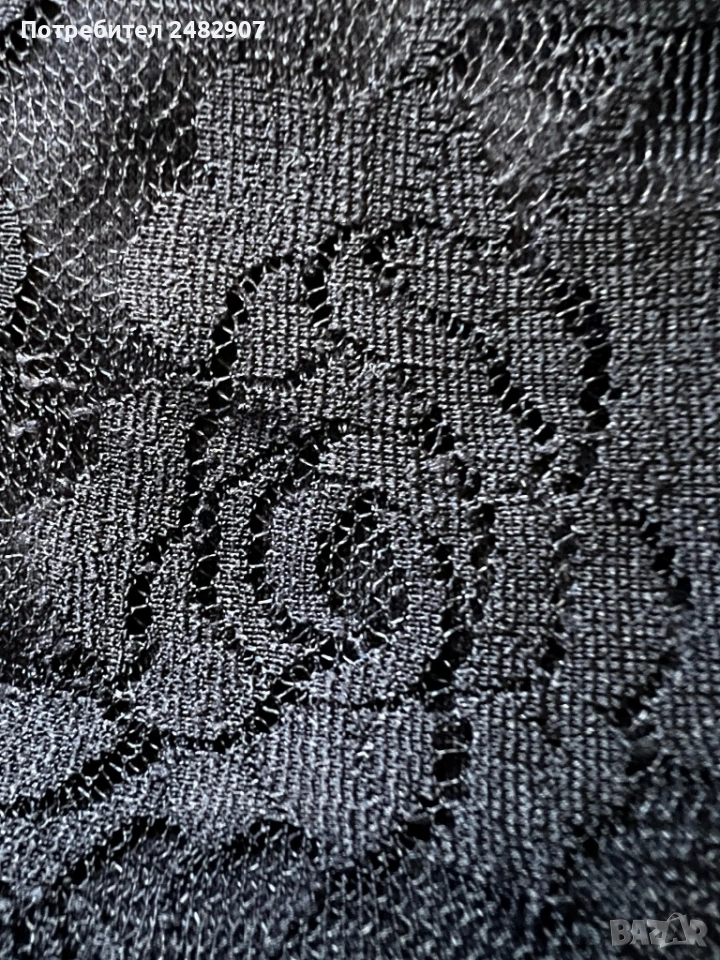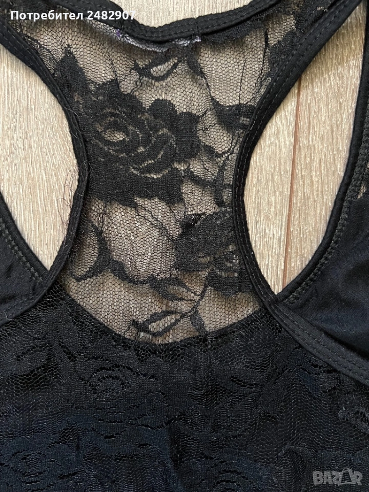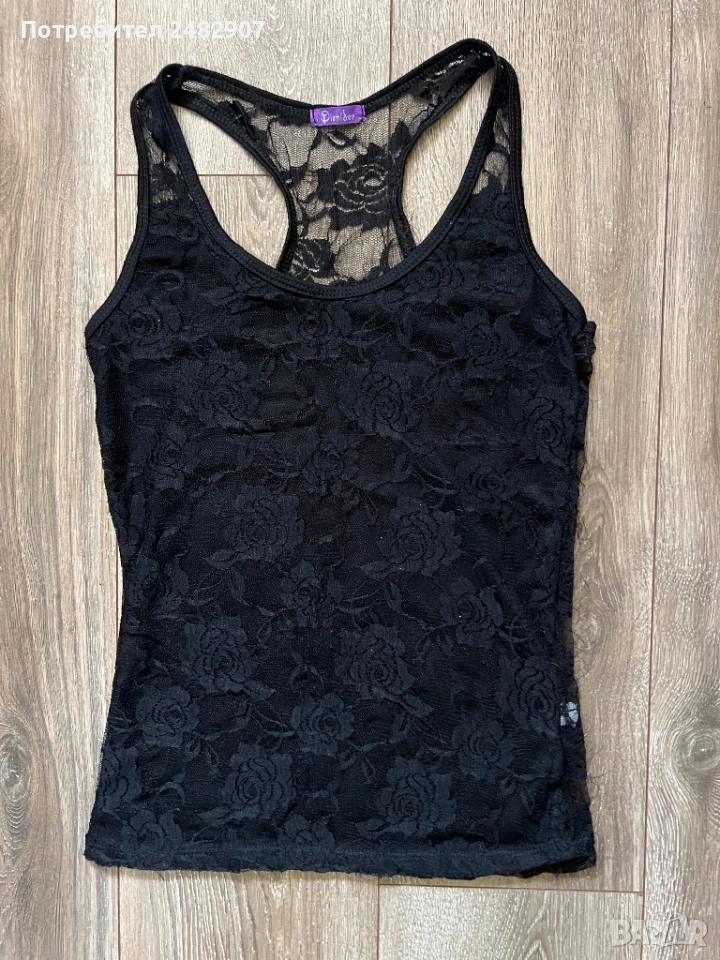 Черен дамски потник - дантела, размер S. Съдържа 65 % памук и 35 % полиестер. Ширина в раменете - 26 см, ширина под мишниците - 37 см, ширина в долната част - 38 см, дължина от рамото до долу - 59 см. Много запазен, почти не е използван, леко еластичен.