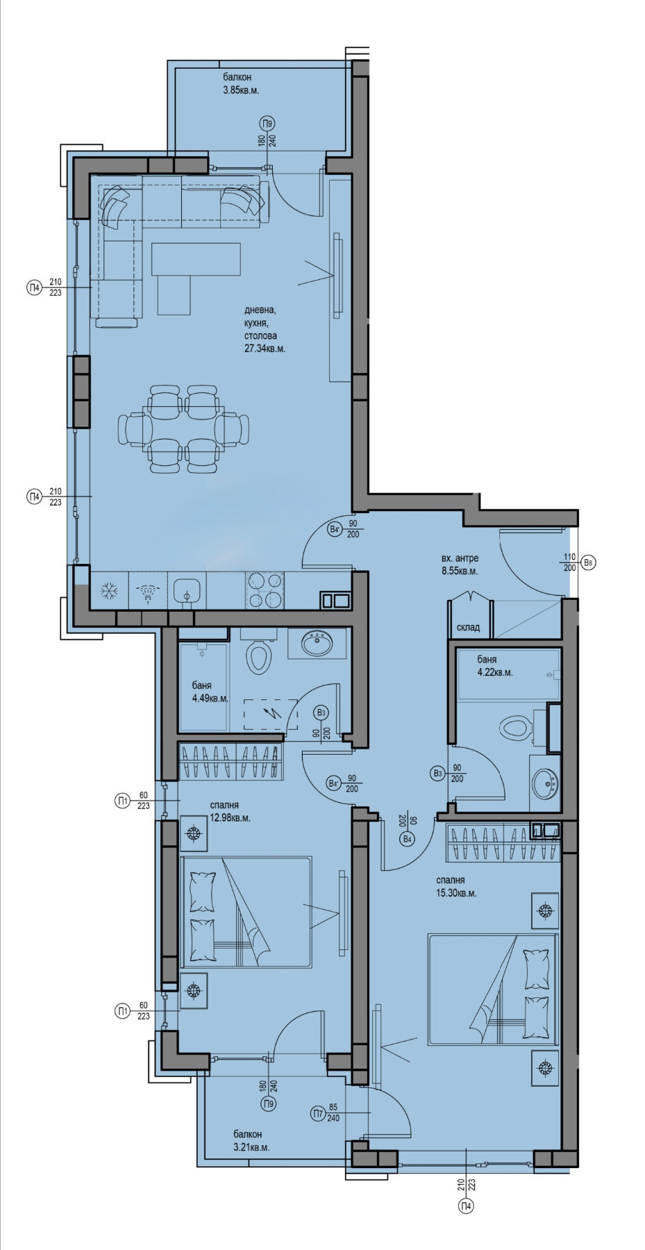 ➡ Разпределение: входно антре, дневна с трапезария и кухненски бокс, две непреходни спални, две тераси, две бани с тоалетна и складово помещение.