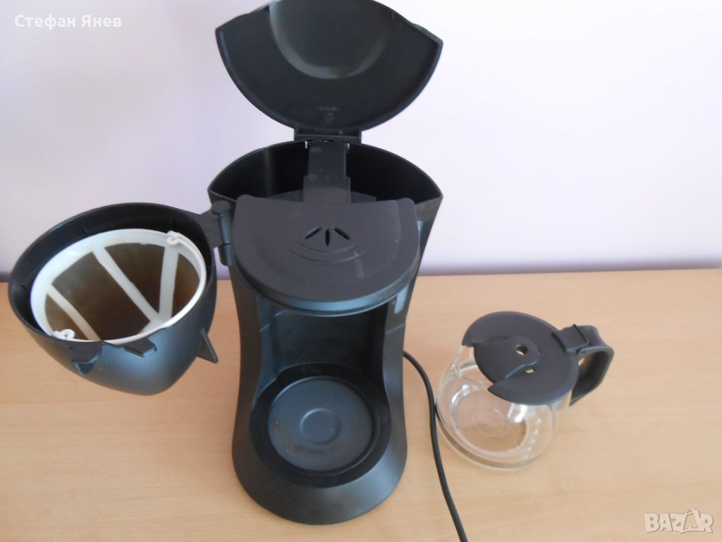 Кафемашина за шест броя кафета. Мощност от 600 вата. Нагреваема плоча. Безкапкова система. Постоянен филтър, който лесно се почиства. Ползвана е само два пъти. Работи си коректно.
