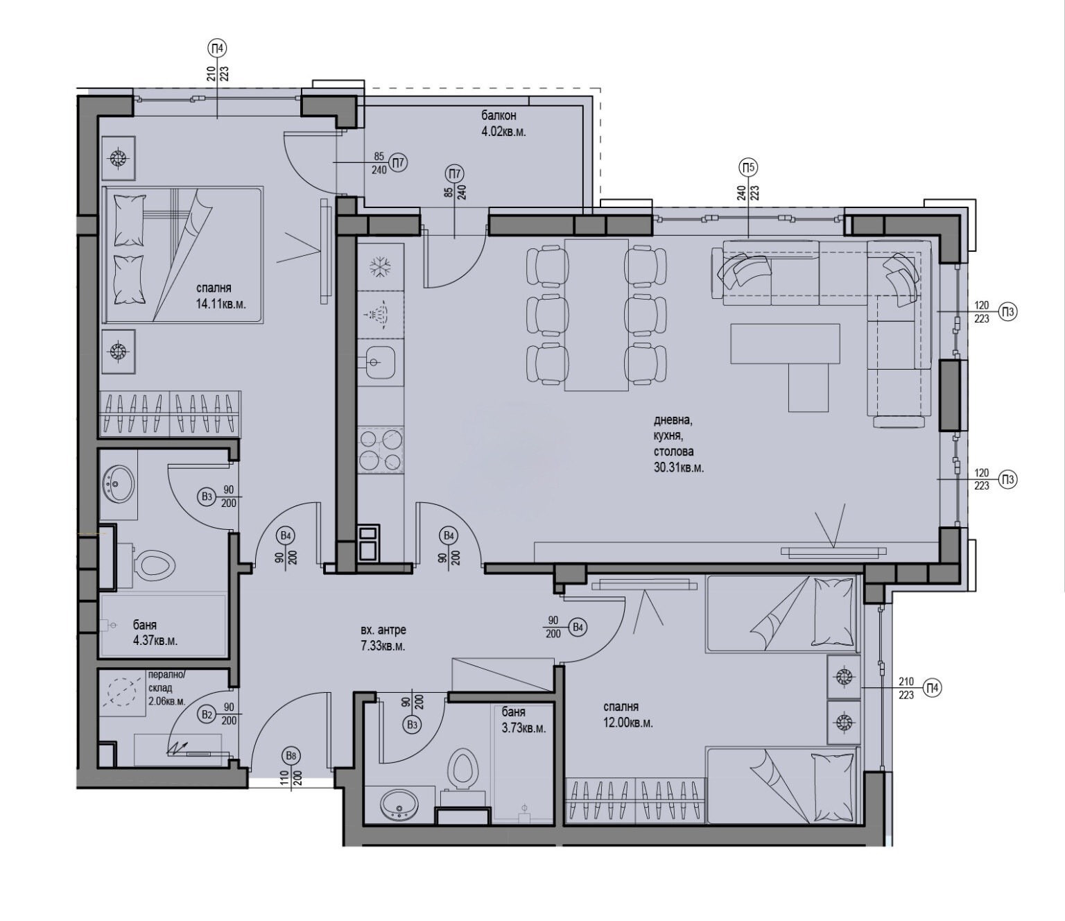 ➡ Разпределение: входно антре, дневна с трапезария и кухненски бокс, две непреходни спални, тераса, две бани с тоалетна и складово помещение.