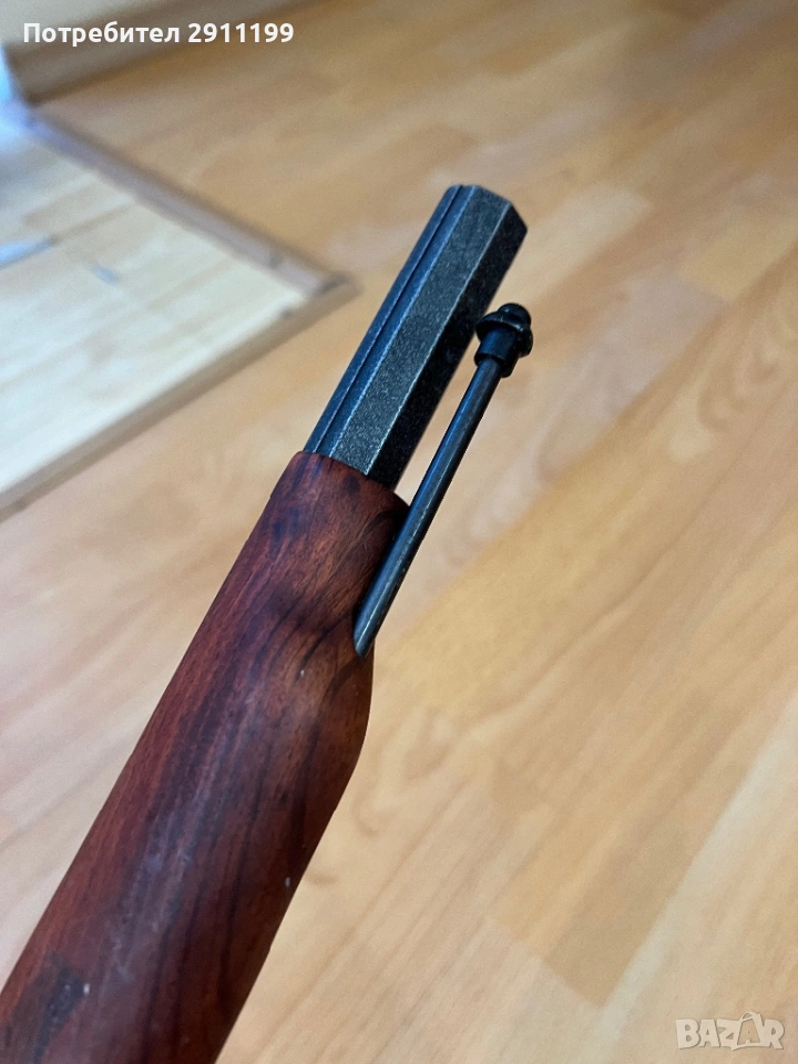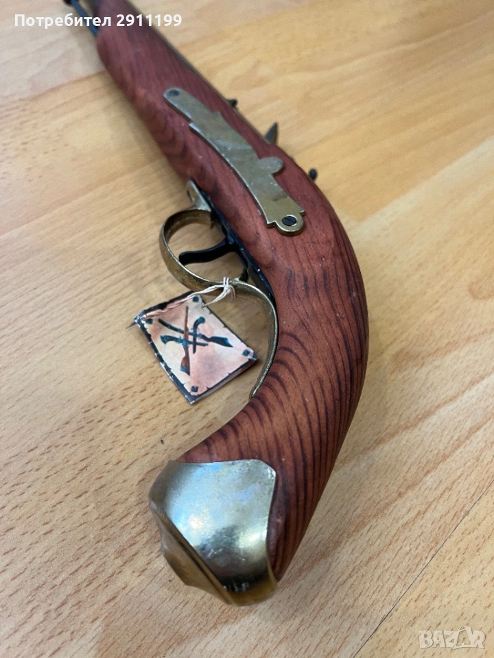 и дърво. Дълъг е 43 см. Механизма му работи.