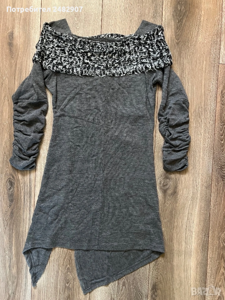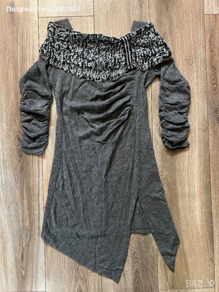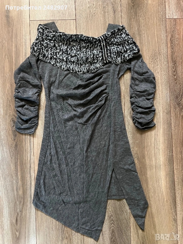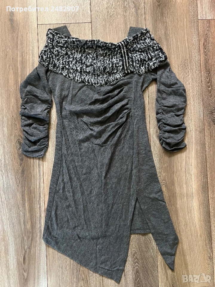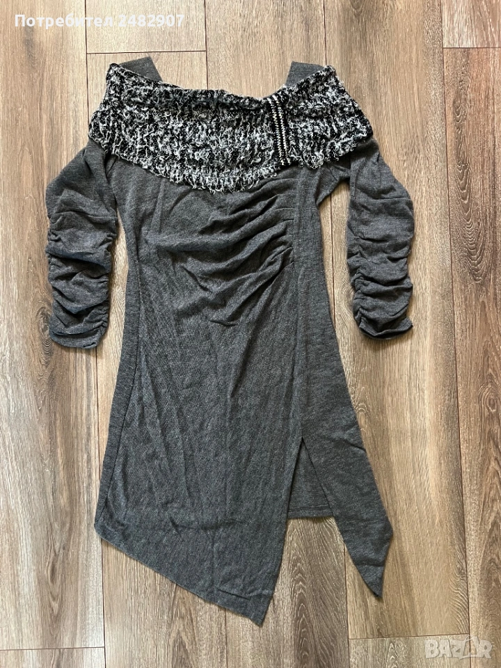 Машинно плетена сива дамска рокля/туника, размер S. Ширина в раменете - 34 см, ширина под мишниците - 41 см, ширина в долната част - 46 см, дължина от рамото до долу - 85 см (отпред) и 76 см (отзад), дължина на ръкава от рамото - 49 см, ширина на ръкава в долната част - 10 см. Много запазена, обличана веднъж за повод, тънка, леко еластична, ефектна, с набран ефект отпред и на ръкавите.