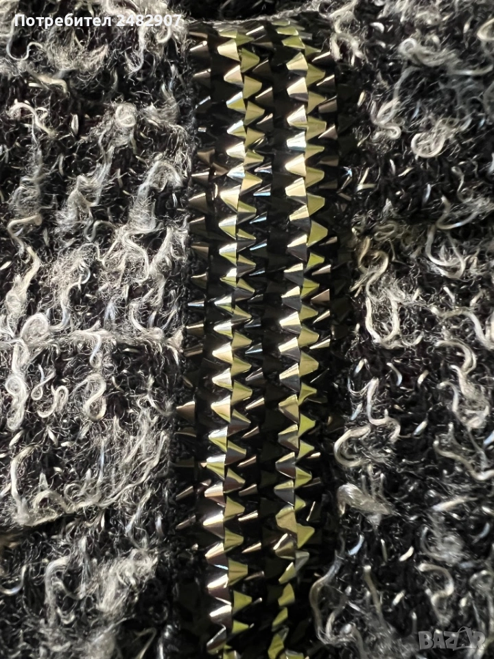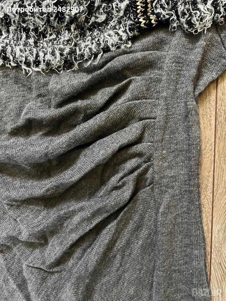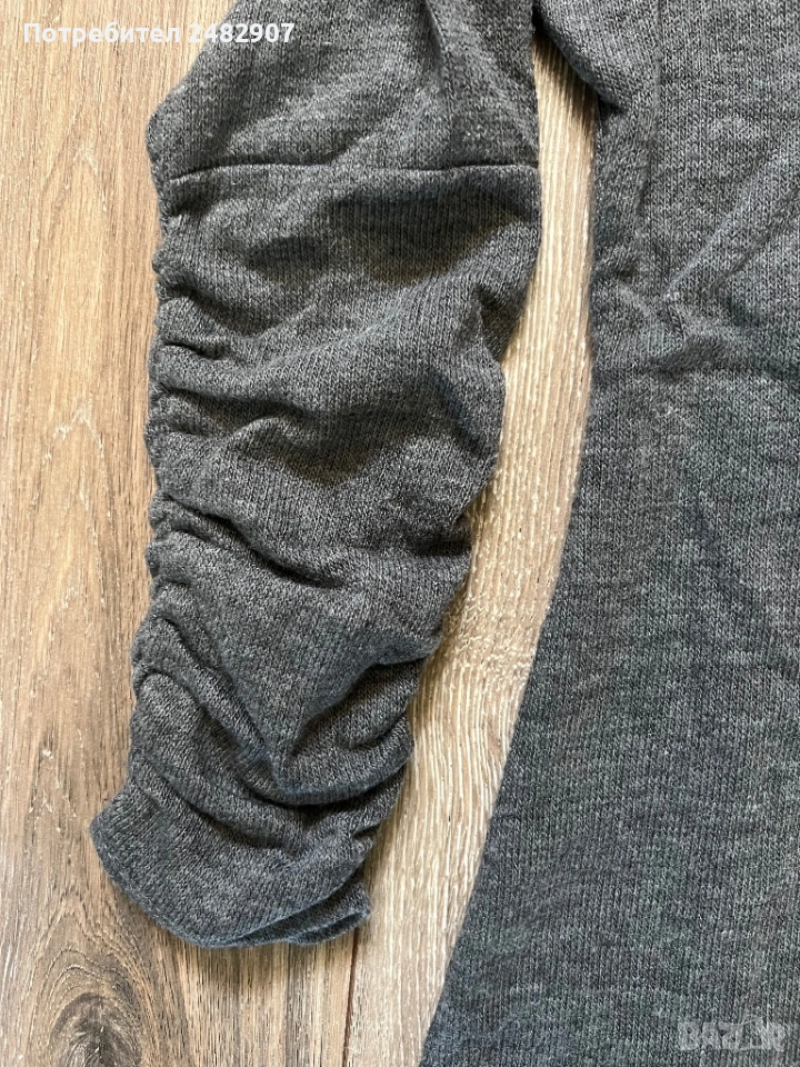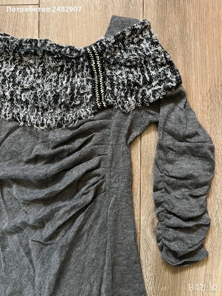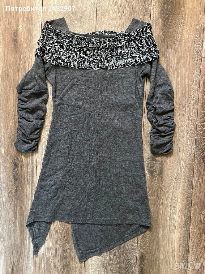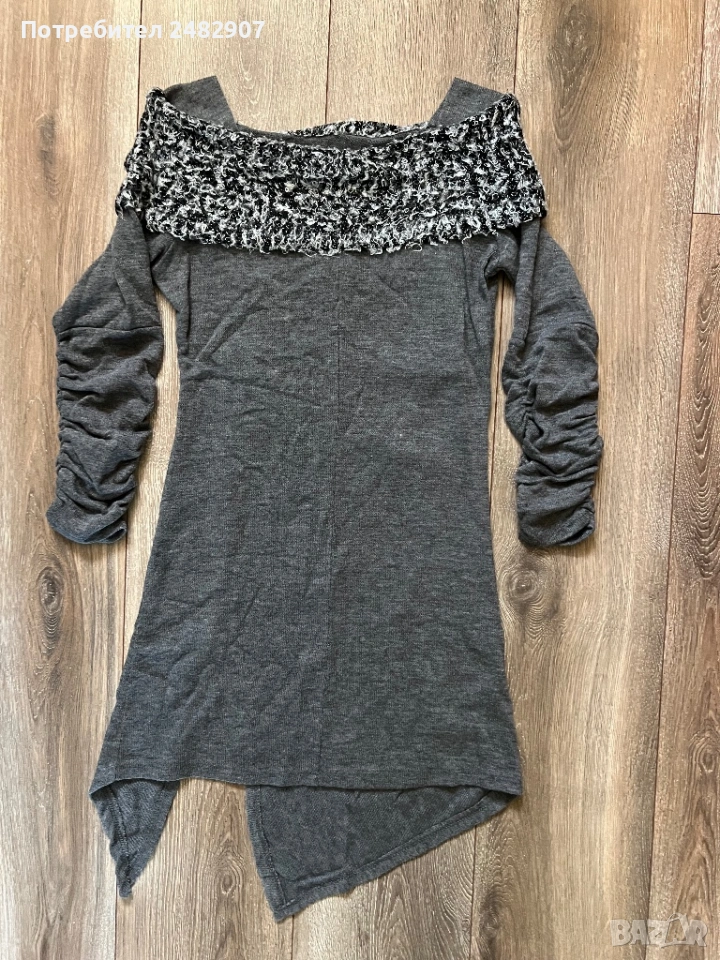 Машинно плетена сива дамска рокля/туника, размер S. Ширина в раменете - 34 см, ширина под мишниците - 41 см, ширина в долната част - 46 см, дължина от рамото до долу - 85 см (отпред) и 76 см (отзад), дължина на ръкава от рамото - 49 см, ширина на ръкава в долната част - 10 см. Много запазена, обличана веднъж за повод, тънка, леко еластична, ефектна, с набран ефект отпред и на ръкавите.