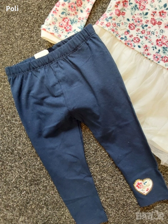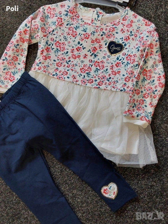 Продавам красив бебешки комплект Guess за момиче. Комплектът включва блузка с дълъг ръкав с цветен десен и тюлена част като рокличка, както и тъмносин клин с декоративно сърце.