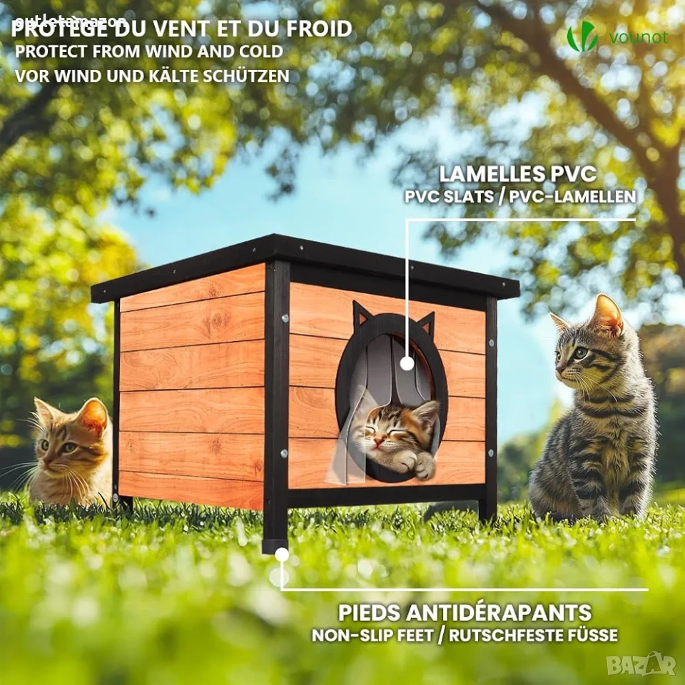 VOUNOT® Къщичка за котки, градинска, дървена, с врата с котешки уши, водоустойчив отваряем покрив, външен подслон за домашни любимци. Тази дървена къщичка предлага на вашата котка безопасен и топъл подслон. Дървото действа като топлоизолатор, помагайки да се запази топлината през зимата и прохладата през лятото. В допълнение, PVC ламели осигуряват оптимална циркулация на въздуха, като по този начин създават приятна атмосфера, в която котката ви да се сгуши вътре.