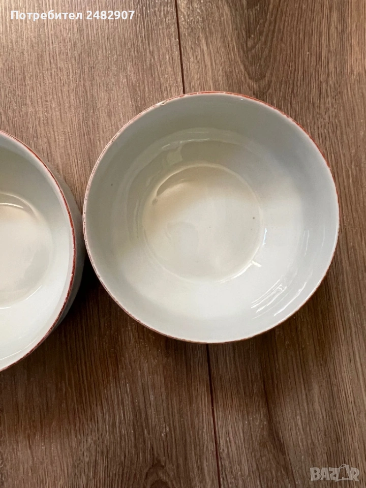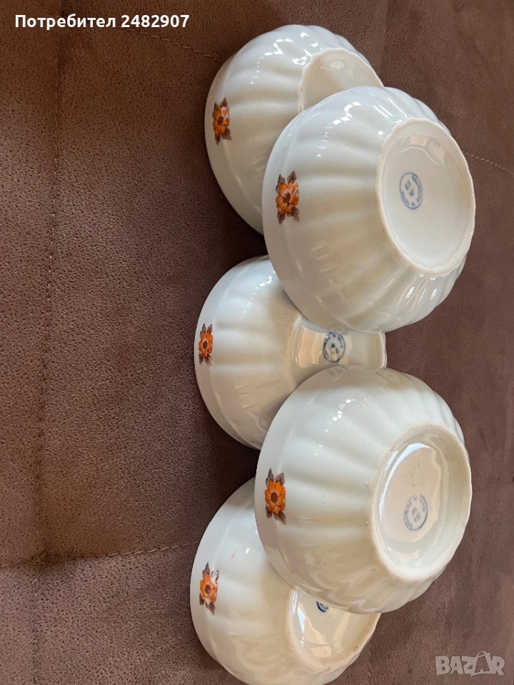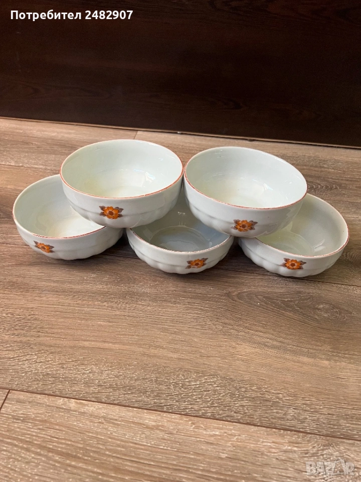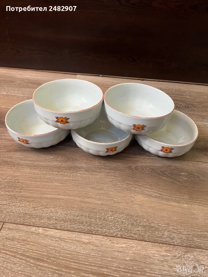 Комплект от 5 броя порцеланови дълбоки ретро купи с вместимост - 600 ml. Диаметър в долната част - 8 см, диаметър в горната част - 14 см, височина - 6 см. Много запазени, почти не са използвани, с дребни фабрични забележки, видими от снимките. Цената е за комплекта.