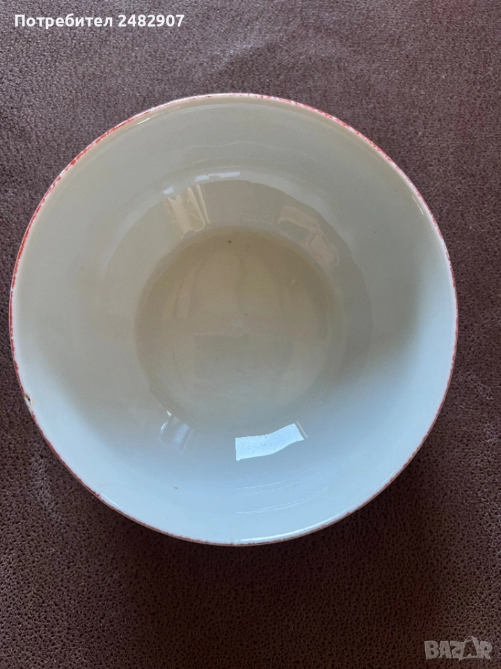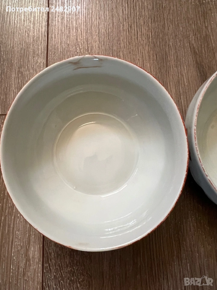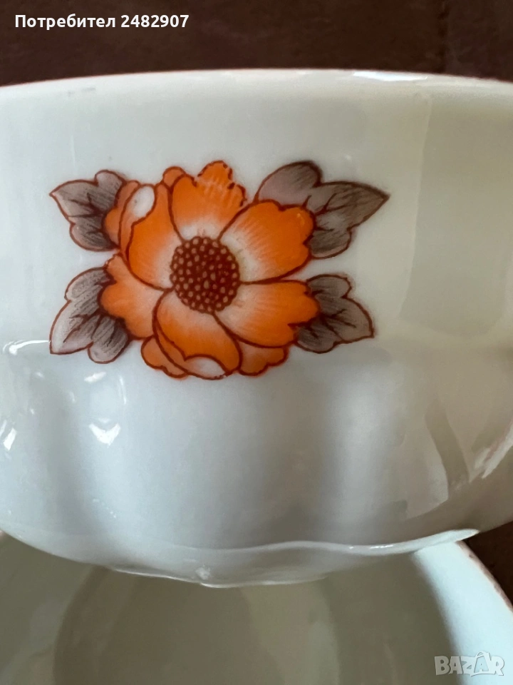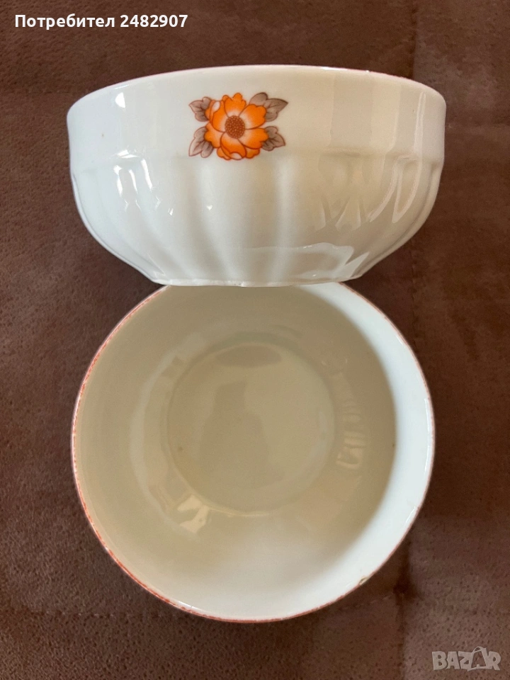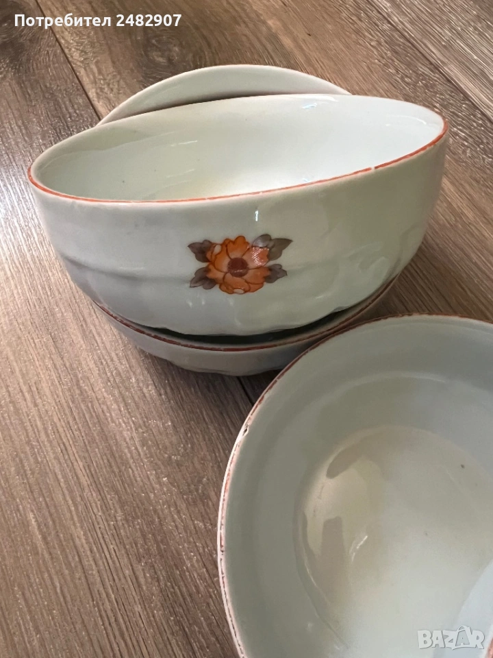 Комплект от 5 броя порцеланови дълбоки ретро купи с вместимост - 600 ml. Диаметър в долната част - 8 см, диаметър в горната част - 14 см, височина - 6 см. Много запазени, почти не са използвани, с дребни фабрични забележки, видими от снимките. Цената е за комплекта.
